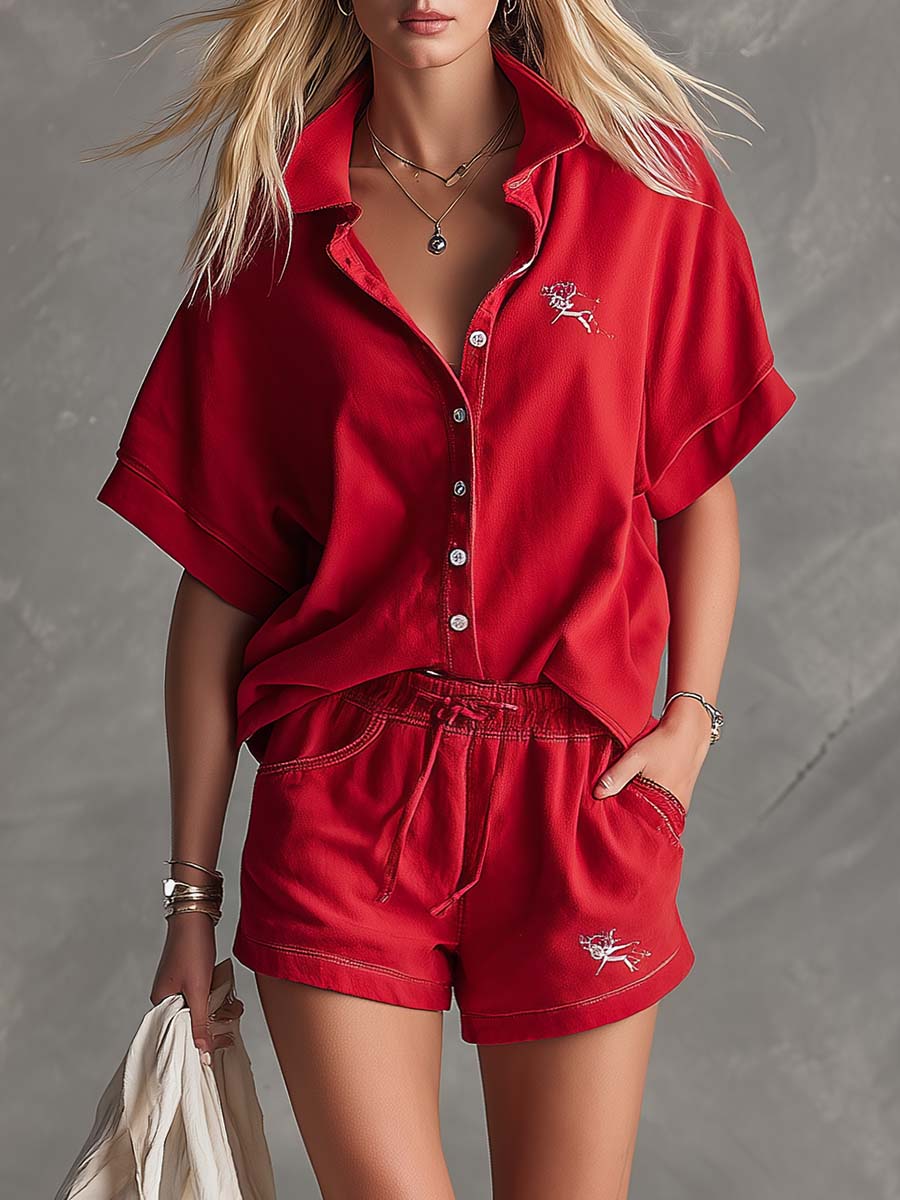 Retro-style Sporty Red Cotton Collared Button-down Top And Shorts Set