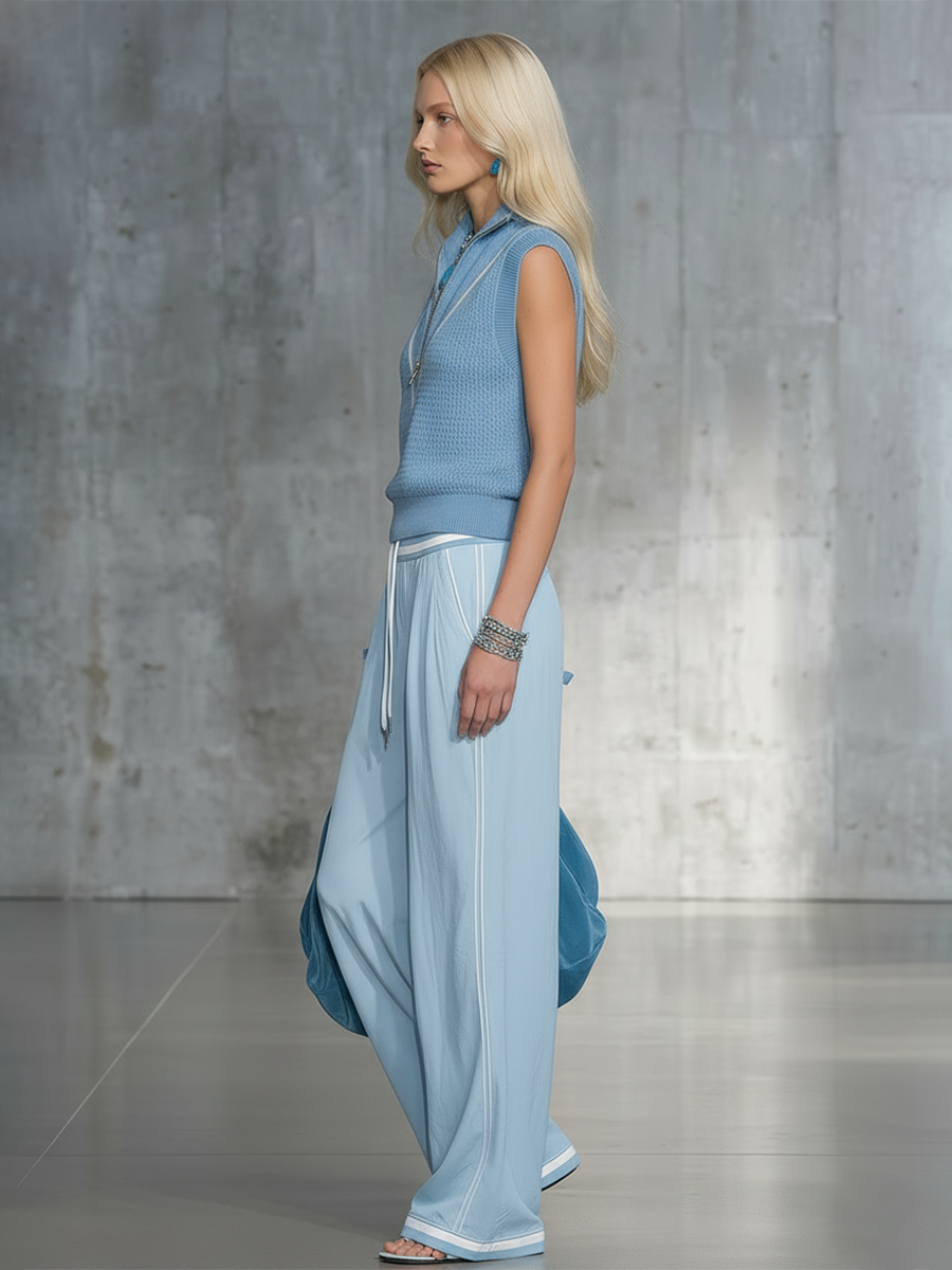 Retro Half-Zip Sleeveless Knit Top And Contrast-Trim Wide-Leg Pants Set