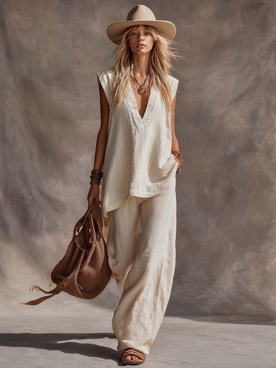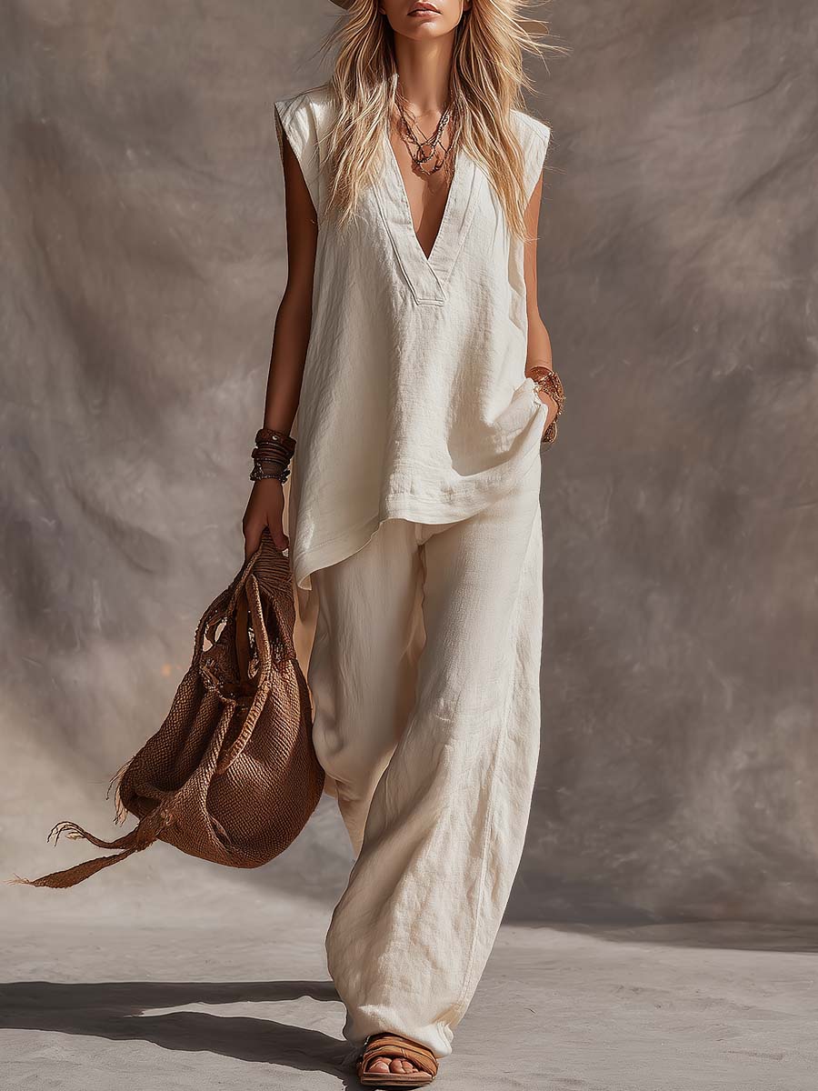 Casual Simple Bohemian V-Neck Off White Cotton-Linen Top And Pants Set