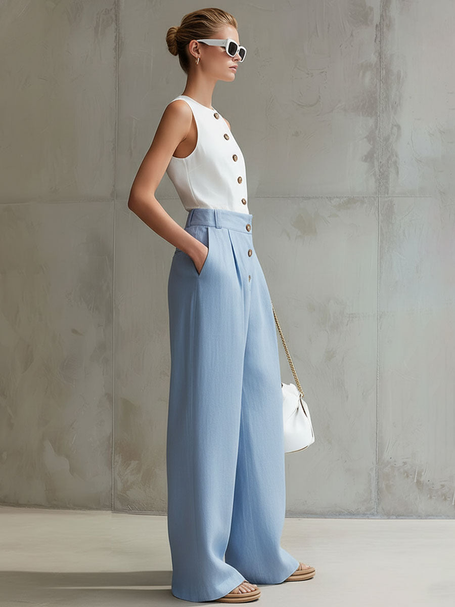 Stylish And Casual Sleeveless V-neck Button-down Top And Wide-leg Trousers Set