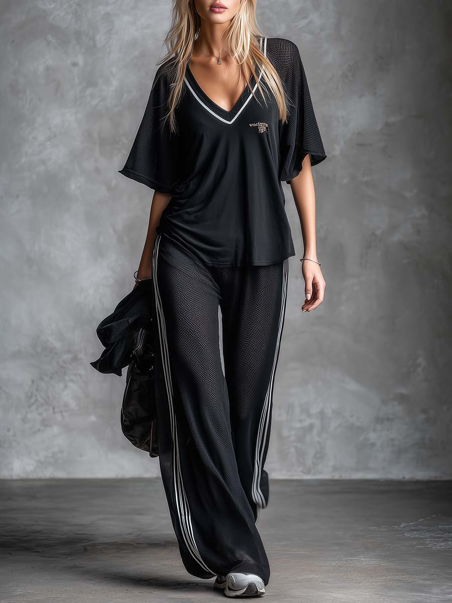 Retro Sporty Black V-Neck Mesh Short-Sleeve Top And Pants Set