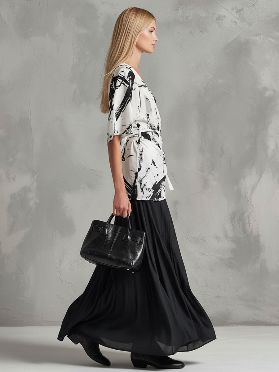 Retro-Elegant Color-Block Chiffon Blouse And Black Skirt Set