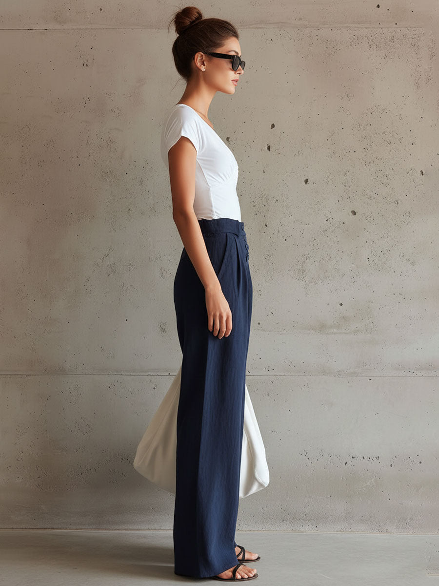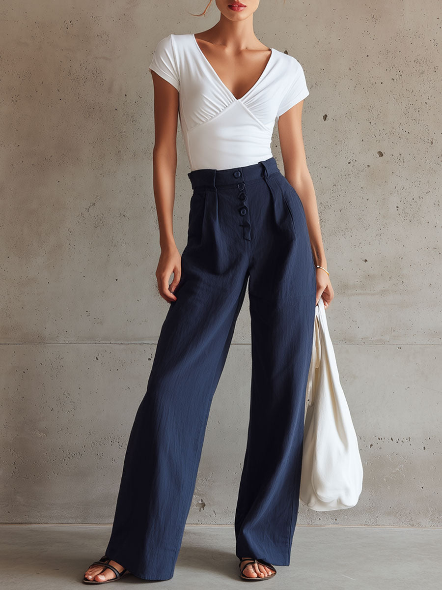 Casual Retro White Pleated Short-Sleeve T-Shirt And Linen Wide-Leg Pants Set