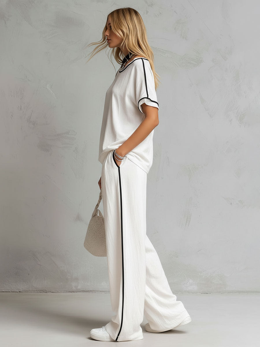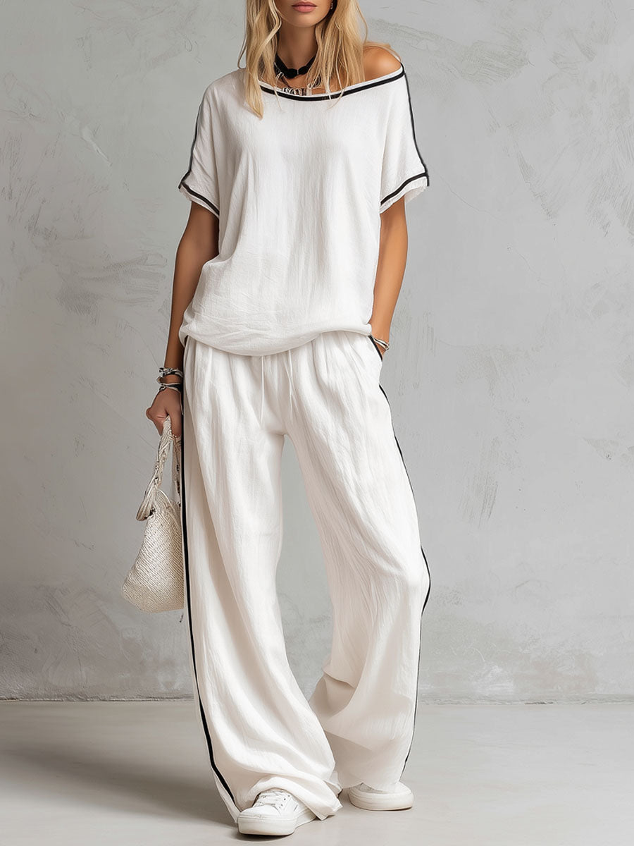 Casual Urban Style Contrast-Trimmed White T-Shirt & Wide-Leg Pants Cotton-Linen Set