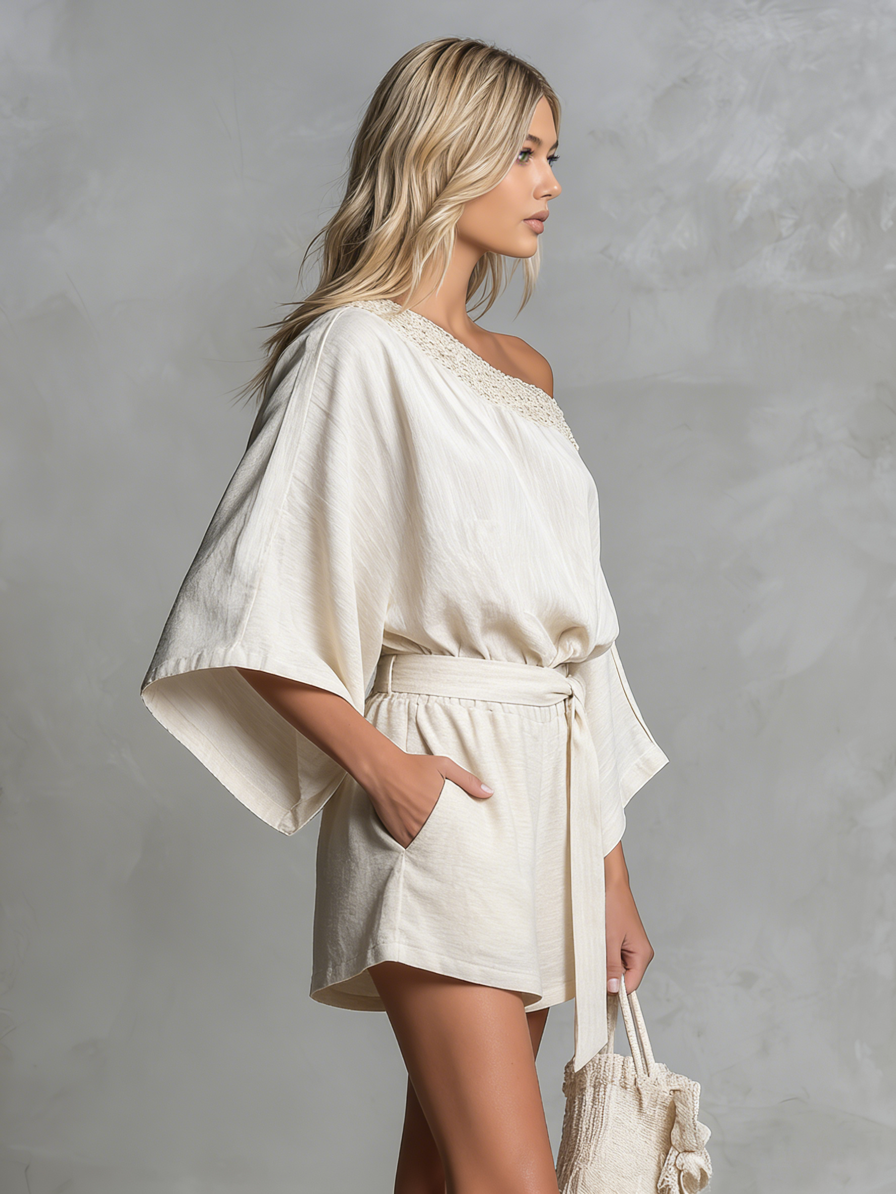 Casual And Relaxed One-shoulder Lace-trimmed Short-sleeved Top And Shorts Set
