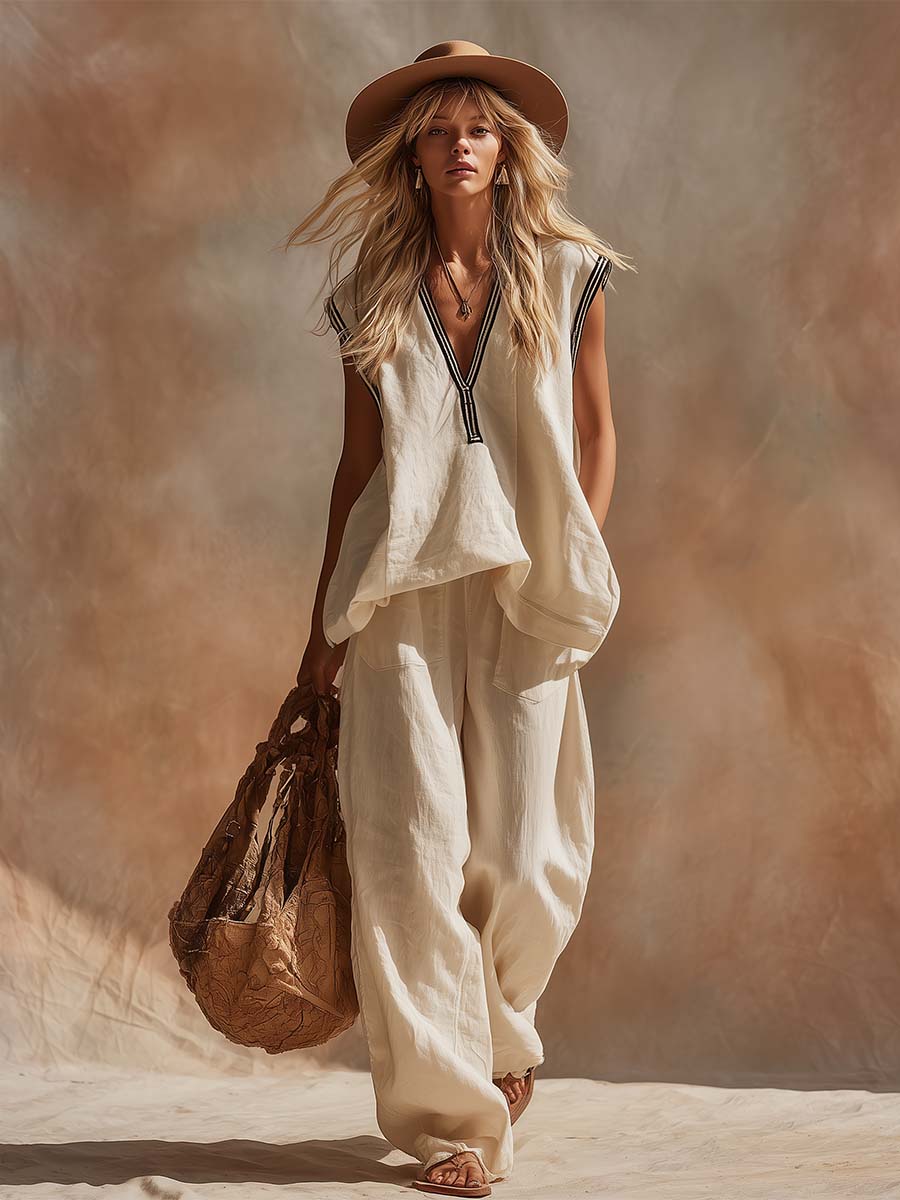 Retro-style Comfortable Bohemian V-neck Off-white Cotton And Linen Top And Pants Set