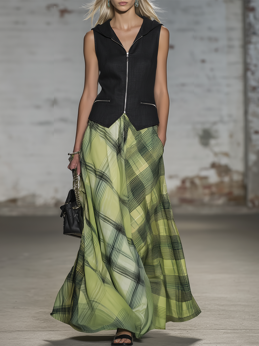 Casual And Stylish V-neck Zip-up Sleeveless Top And Plaid Chiffon Skirt Set