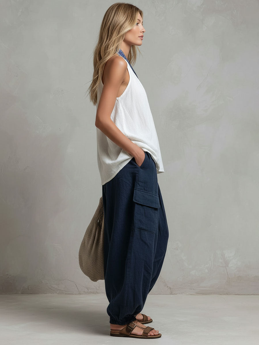 Loose-fitting V-neck Embroidered Sleeveless Top And Trousers Cotton-linen Set