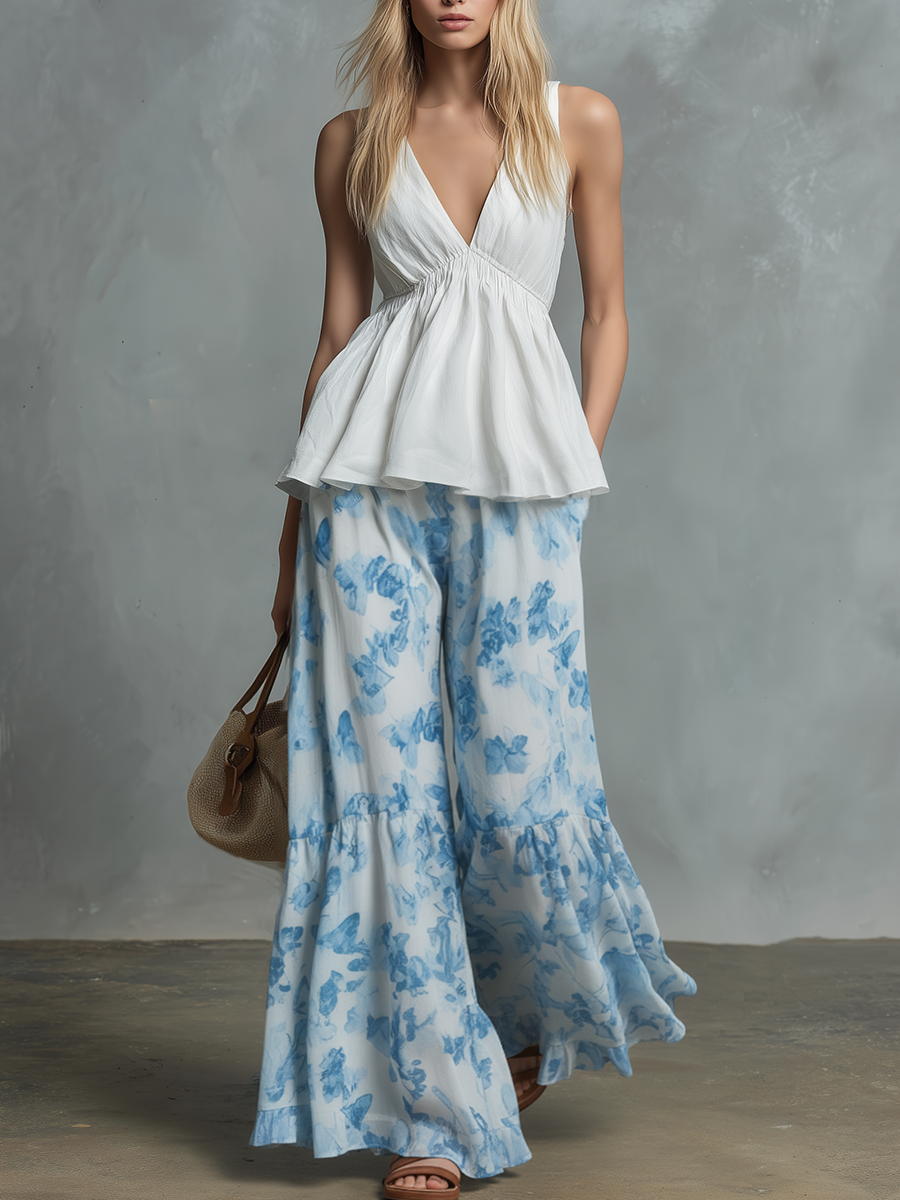 Retro-chic Sleeveless V-neck Ruffled Top And Printed Chiffon Trousers Set