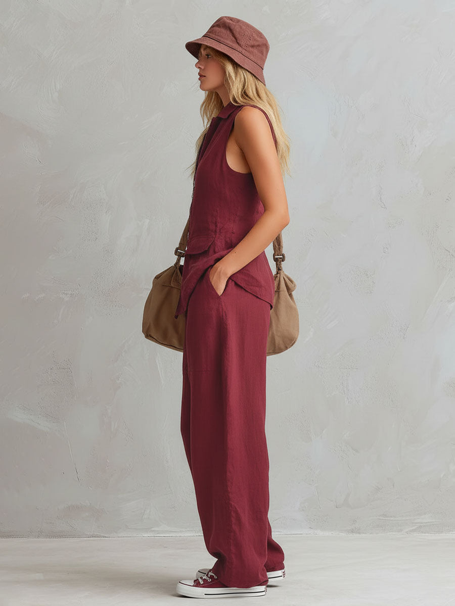 Solid Color Stand-up Collar Zip-up Sleeveless Top And Pants Cotton Linen Set