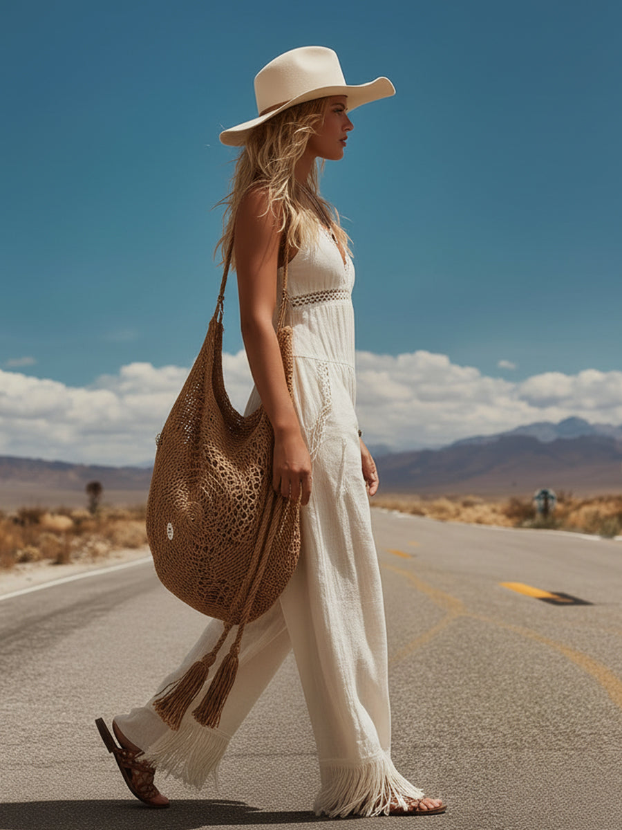 Western-Style Lace-Trimmed Off-White Tasseled Cotton-Linen Sleeveless Jumpsuit