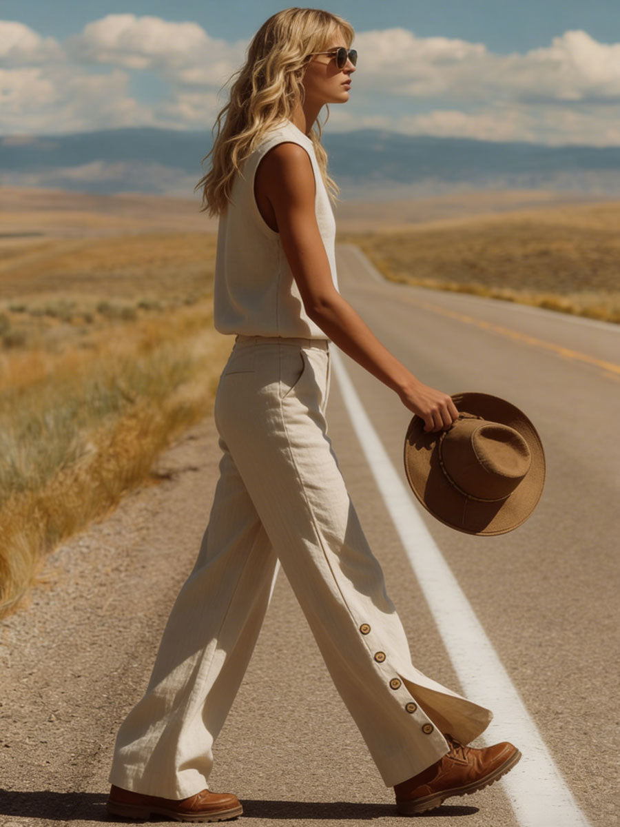 Western Bohemian Retro Apricot Cotton Linen Sleeveless Top And Slit Pants Set