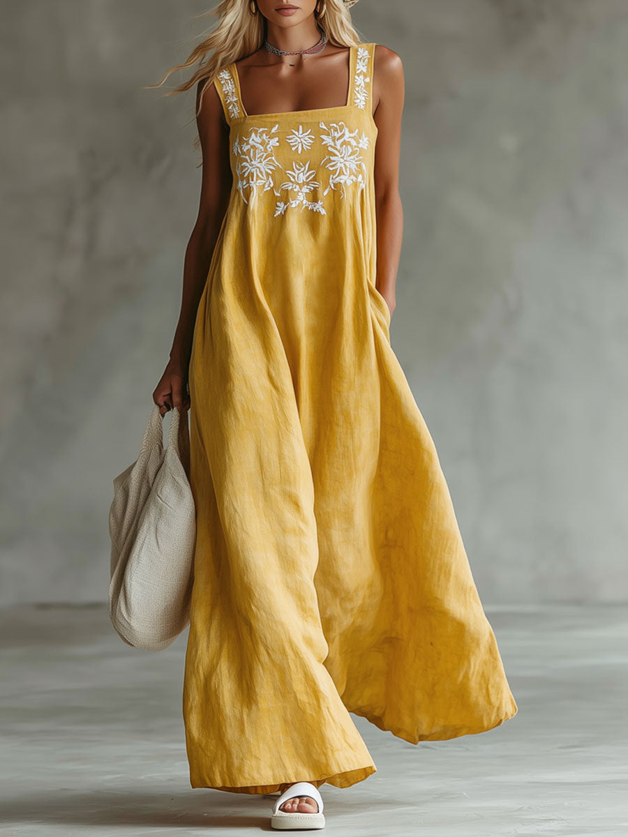 Yellow Cotton And Linen Embroidered Sleeveless Maxi Dress