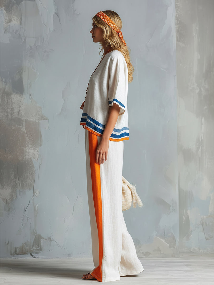 Casual Urban Style Contrast-Trimmed White T-Shirt & Wide-Leg Pants Cotton-Linen Set
