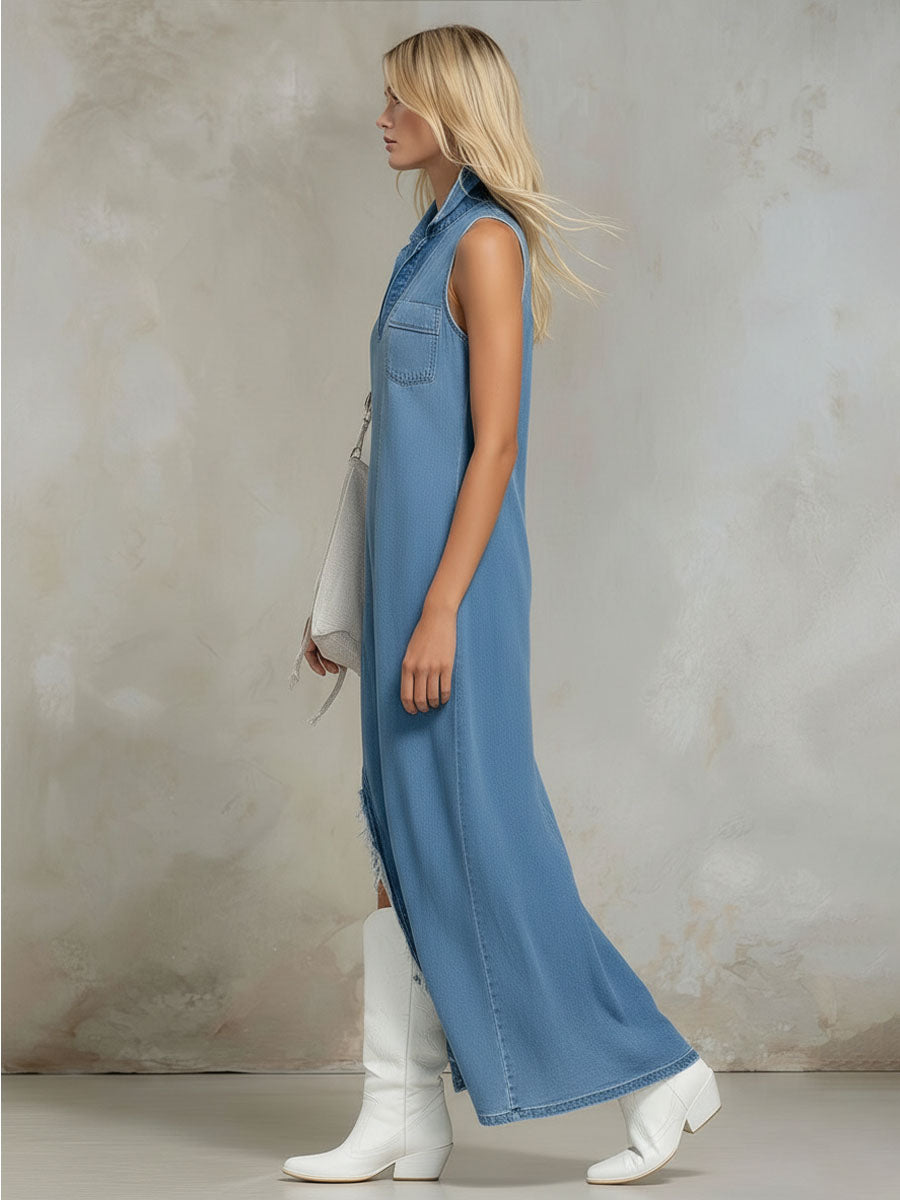 V-neck Side-slit Sleeveless Denim Maxi Dress
