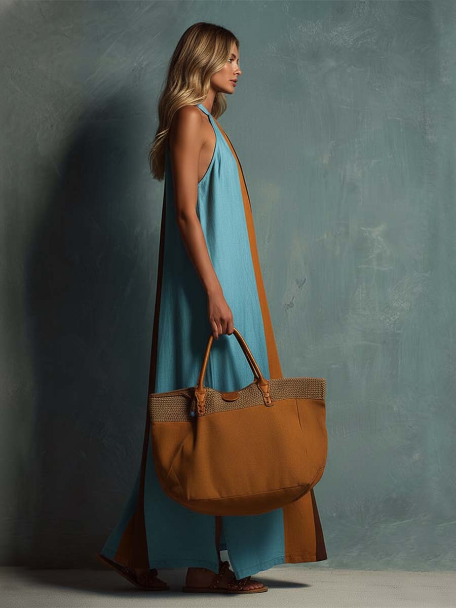 Retro Bohemian Halter Neck Blue And Brown Color-blocked Cotton And Linen Maxi Dress