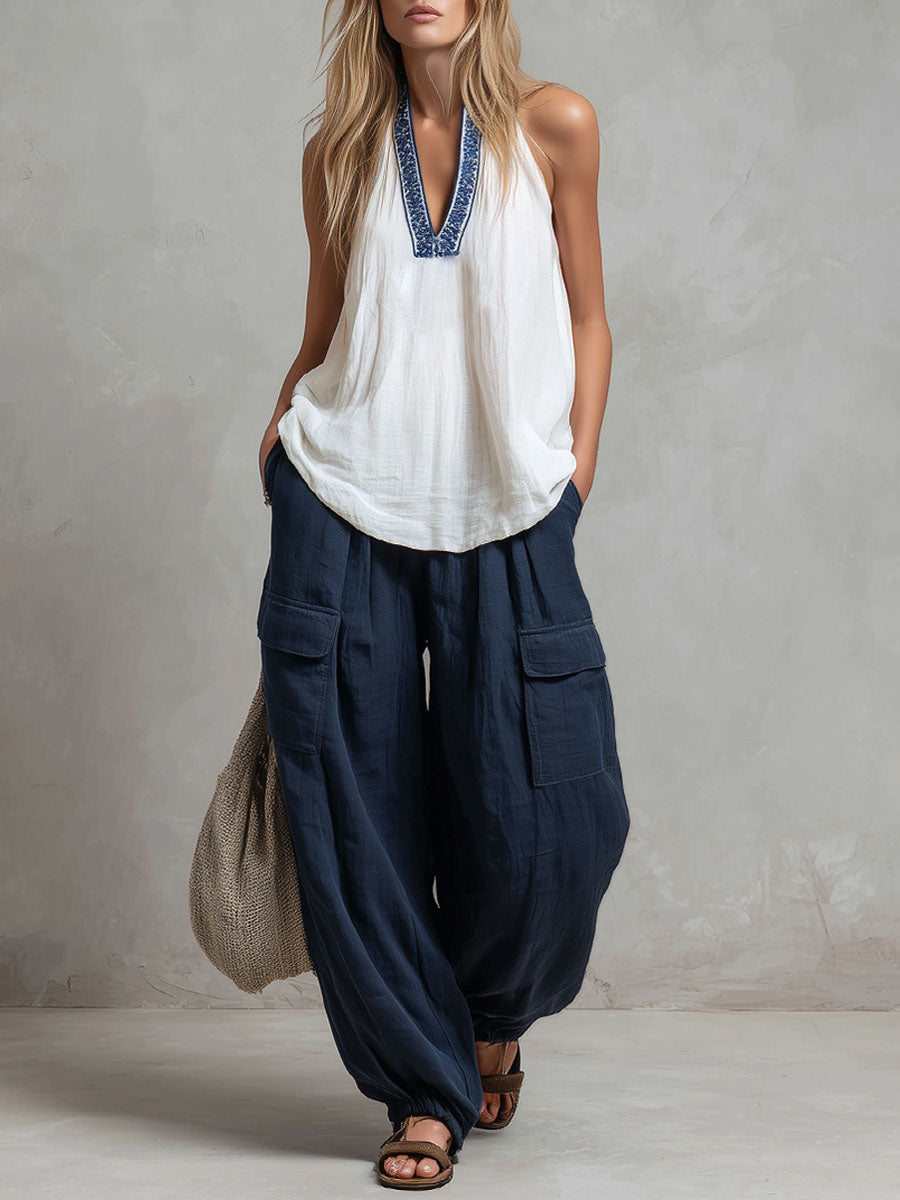 Loose-fitting V-neck Embroidered Sleeveless Top And Trousers Cotton-linen Set