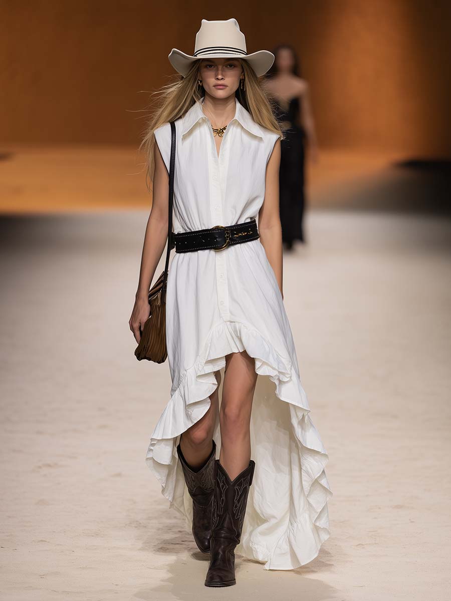 Retro Western White Cotton High-Low Ruffled Hem Shirt Maxi Dress