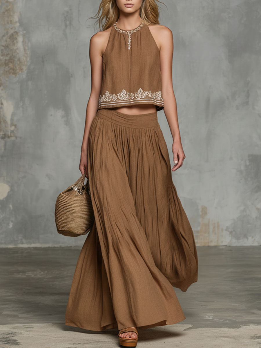 Casual Retro Round Neck Sleeveless Embroidered Top And Long Skirt Set