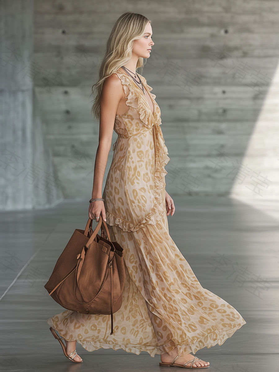 Retro-Chic V-Neck Sleeveless Ruffled Leopard-Print Chiffon Maxi Dress