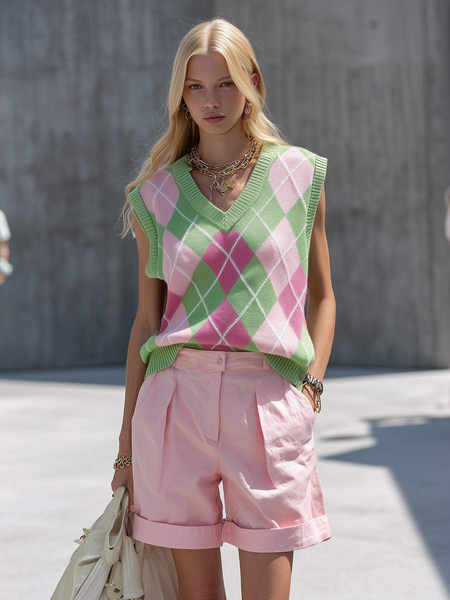2.Design: V-neck, sleeveless, argyle Pattern, Solid-Color Shorts — Two-Piece Set