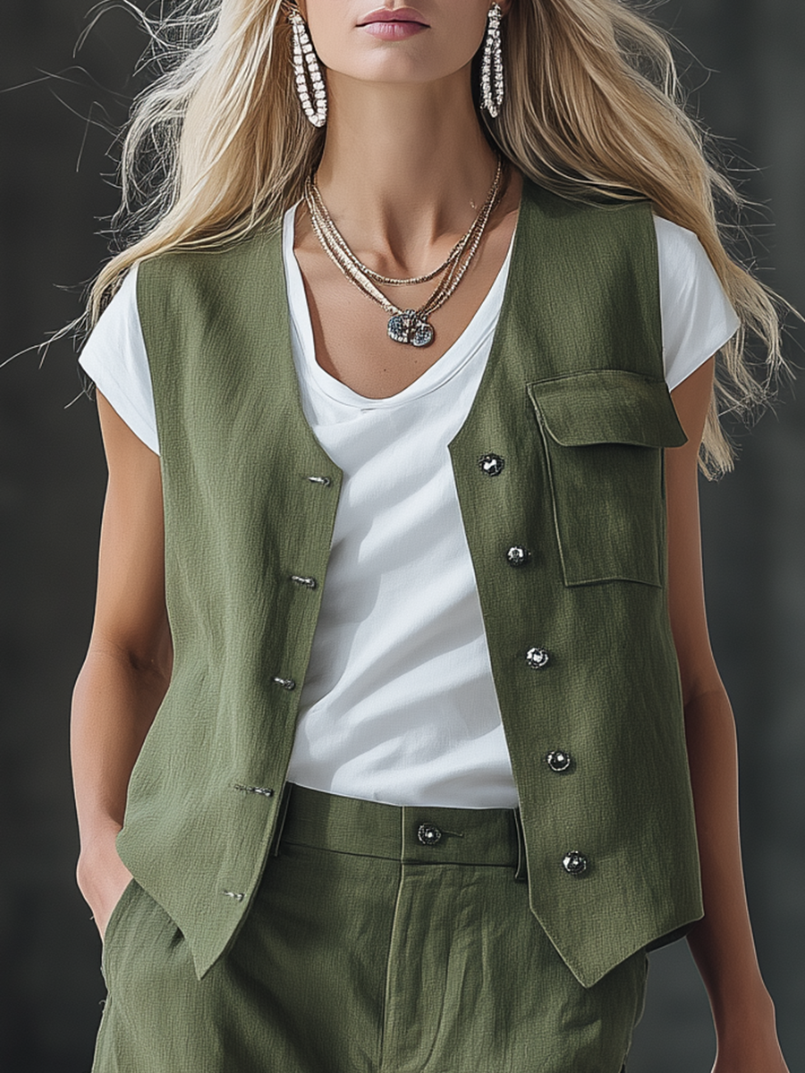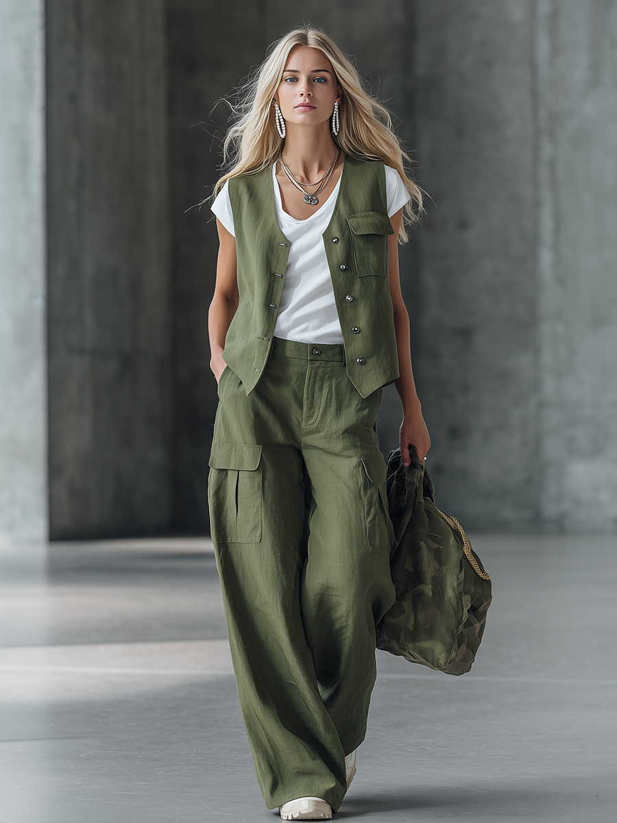 This stylish retro set includes a button-down vest and a pair of loose-fitting trousers, cleverly blending vintage details with modern comfort. The vest features a slightly cropped, boxy silhouette and is adorned with delicate patch pockets or welt pockets, creating a rich medieval feel. The trousers have a natural or slightly high waist, a relaxed fit at the hips, and soft pleats or smooth lines on the front, with wide, flowing legs. The set is made from a breathable linen-cotton blend and comes in a variety of styles, including solid colors, sophisticated checks, and seasonal earth tones, perfectly embodying vintage charm.