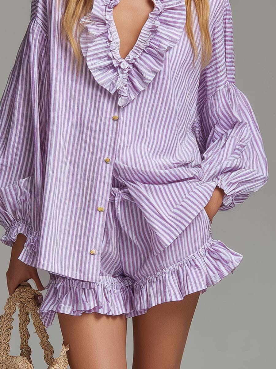 This coordinated two-piece set channels a retro bohemian resort vibe with a soft purple striped pattern and feminine ruffle detailing. The lightweight woven top features a ruffled V-neck and relaxed, breezy sleeves, while the matching shorts offer a comfortable, easy-to-wear silhouette — perfect for warm-weather getaways, beach days, or casual city outings.