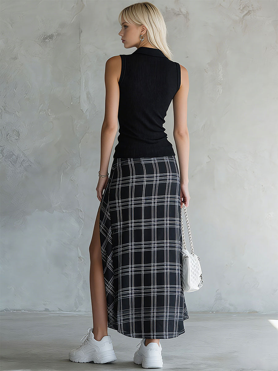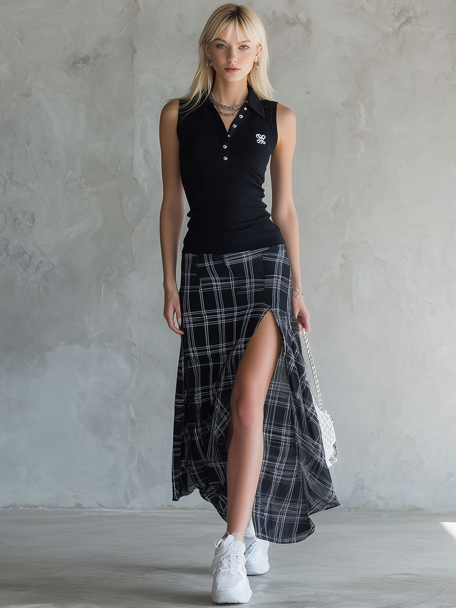 The stylish and casual black knit sleeveless top and plaid chiffon skirt set is a harmonious blend of textures and patterns, perfect for those who appreciate a mix of comfort and style. The black knit sleeveless top offers a sleek and versatile foundation, with its soft, stretchy fabric providing a snug yet comfortable fit. Its minimalist design makes it a wardrobe staple, easily adaptable to various looks and occasions. The sleeveless cut adds a touch of modernity, allowing for easy layering with jackets or cardigans when the temperature drops.