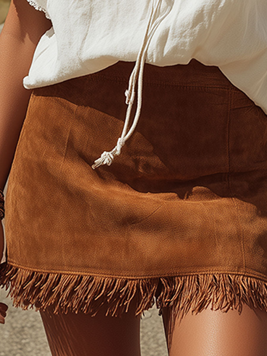 Complementing the T-shirt is the brown fringed faux suede skirt, which brings a playful and dynamic element to the outfit. The faux suede material offers a soft, velvety texture that mimics the look and feel of genuine suede, while the fringe detailing adds movement and a nod to traditional Western fashion. The earthy brown hue of the skirt pairs beautifully with the crisp white top, creating a balanced and cohesive look. This set is perfect for those who appreciate a blend of retro Western influences and modern style. Pair it with ankle boots and a statement belt for a chic, Western-inspired look, or opt for sandals and minimal accessories for a more laid-back vibe.