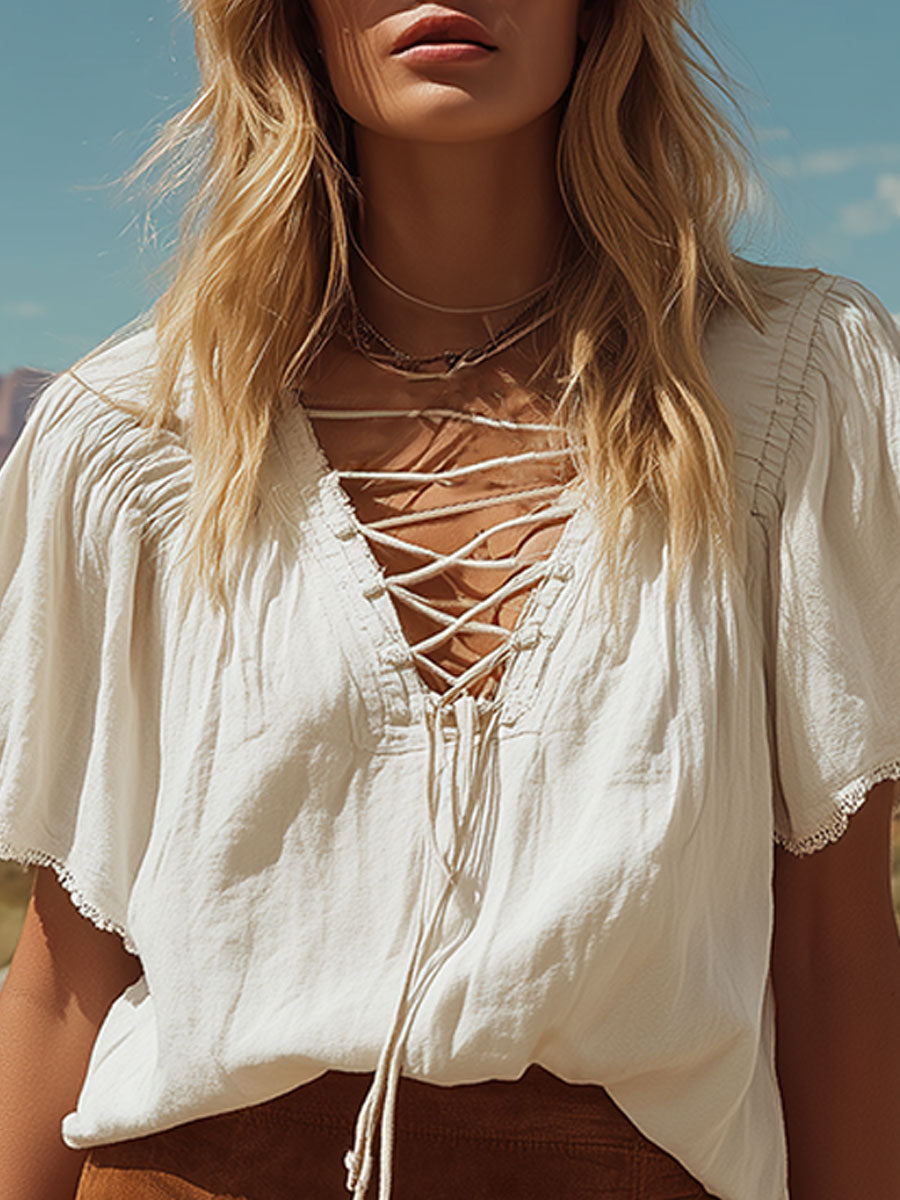 2.Design: Cross-strap design, V-neck, lace trim, short sleeves, tassels.