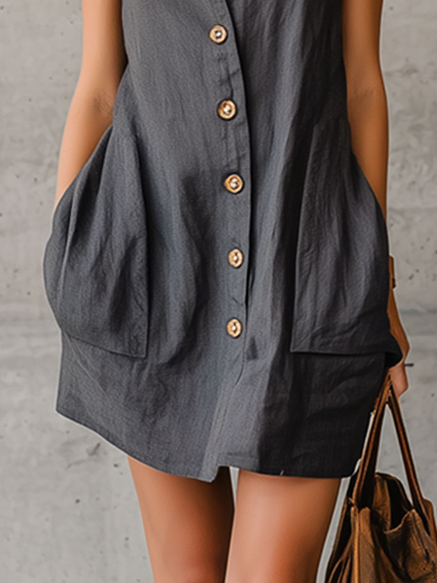The casual retro dark gray cotton linen sleeveless mini dress is a versatile piece that effortlessly combines comfort with style. Crafted from a cotton-linen blend, this dress offers breathability and a soft texture, making it perfect for warm weather. The dark gray hue adds a sophisticated touch, while the sleeveless design and mini length give it a youthful and modern appeal. Its simple silhouette allows for easy styling, making it a go-to choice for various casual occasions.