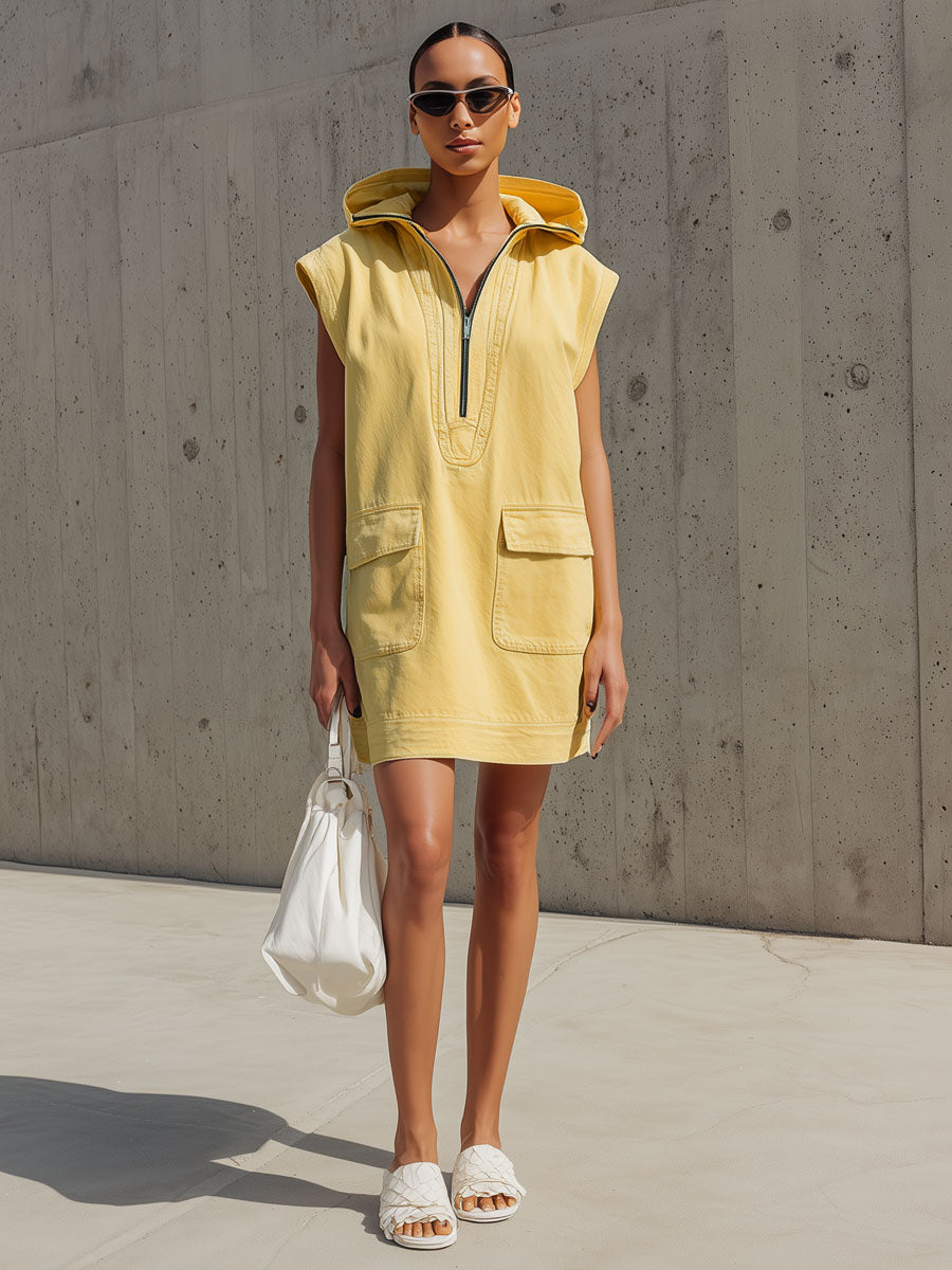 The casual retro sleeveless yellow denim hooded half-zip mini dress is a vibrant and playful piece that combines the timeless appeal of denim with a sporty twist. Crafted from yellow denim, this dress offers a bold pop of color, perfect for making a statement. The sleeveless design and mini length create a youthful and energetic silhouette, while the hooded feature adds a casual, laid-back vibe. The half-zip detail introduces a sporty element, allowing for adjustable styling and comfort.
