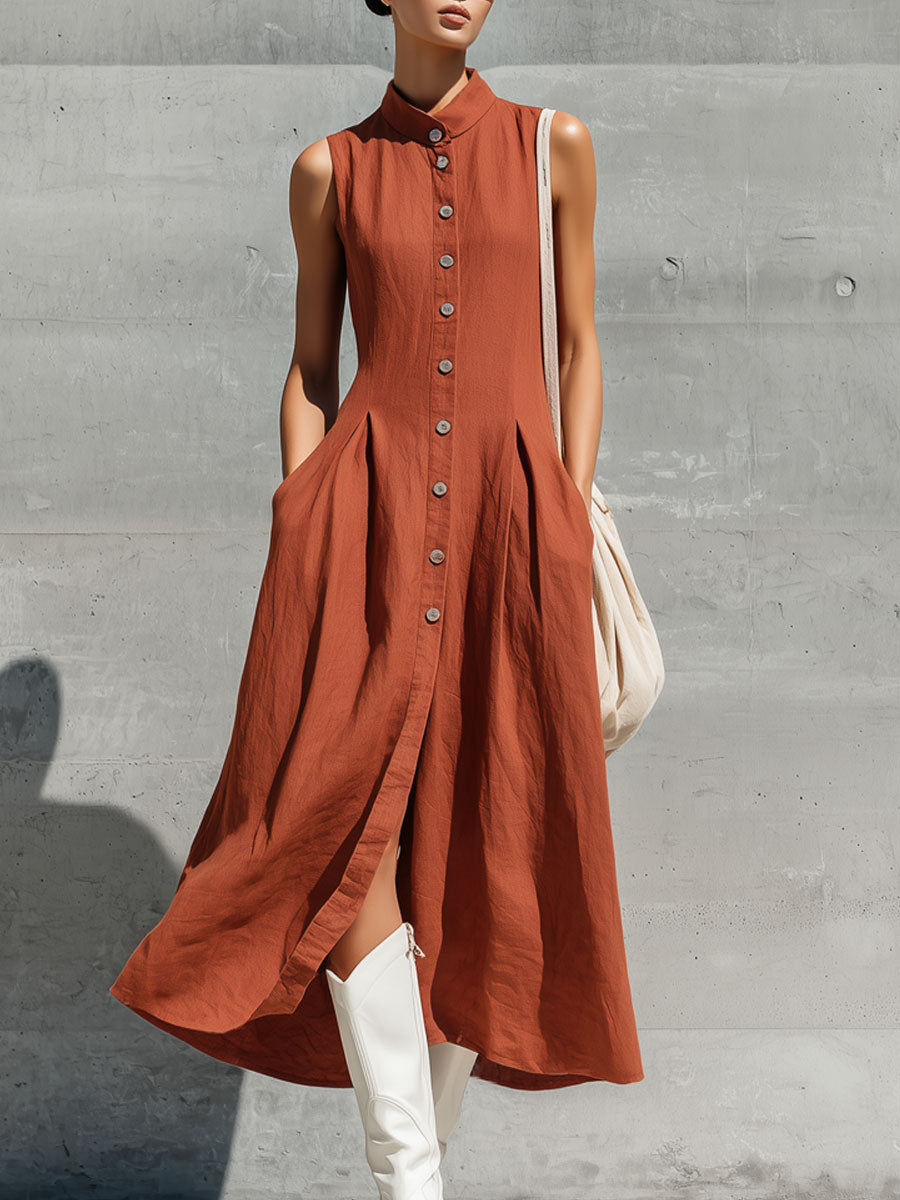 Retro Solid-Color Sleeveless Asymmetrical Placket Cotton-Linen Midi Dress