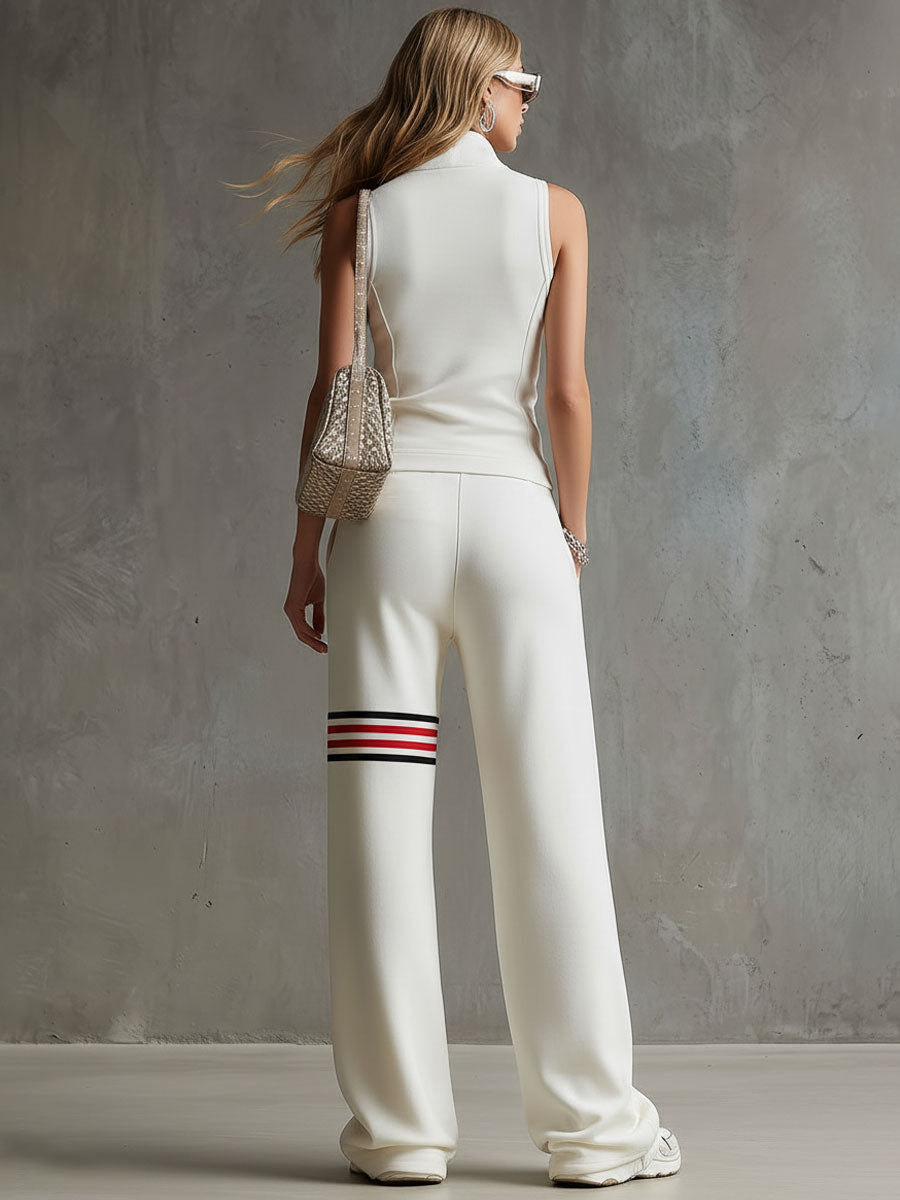 • Sporty Retro White Striped Embroidered Sleeveless Vest And Wide-Leg Pants Set