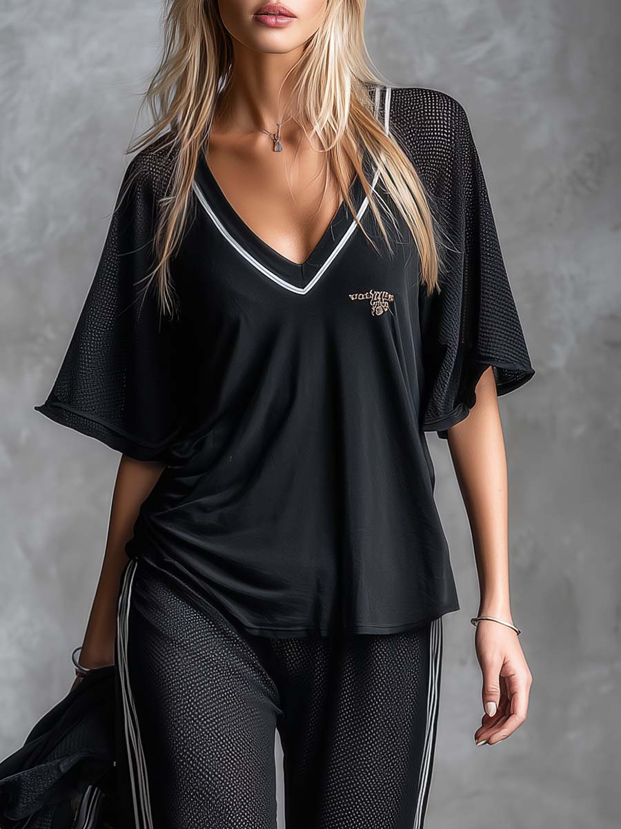 This two-piece set combines retro athletic styling with modern, breathable materials. The lightweight black mesh top features a V-neck and short sleeves for a sporty, slightly sheer look that layers easily over a bralette or fitted tank. The coordinating pants echo the same athletic aesthetic with a relaxed silhouette and an elasticized waistband for comfortable all-day wear. Together they create a cohesive athleisure ensemble that’s equal parts casual and on-trend.