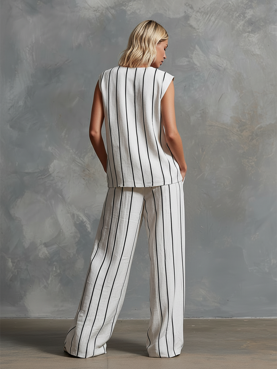 This classic striped white cotton sleeveless top and wide-leg trouser set is a wardrobe essential, offering both comfort and understated sophistication. The breathable cotton fabric and classic stripe pattern make it perfect for spring and summer—effortlessly creating various styles with just one set.