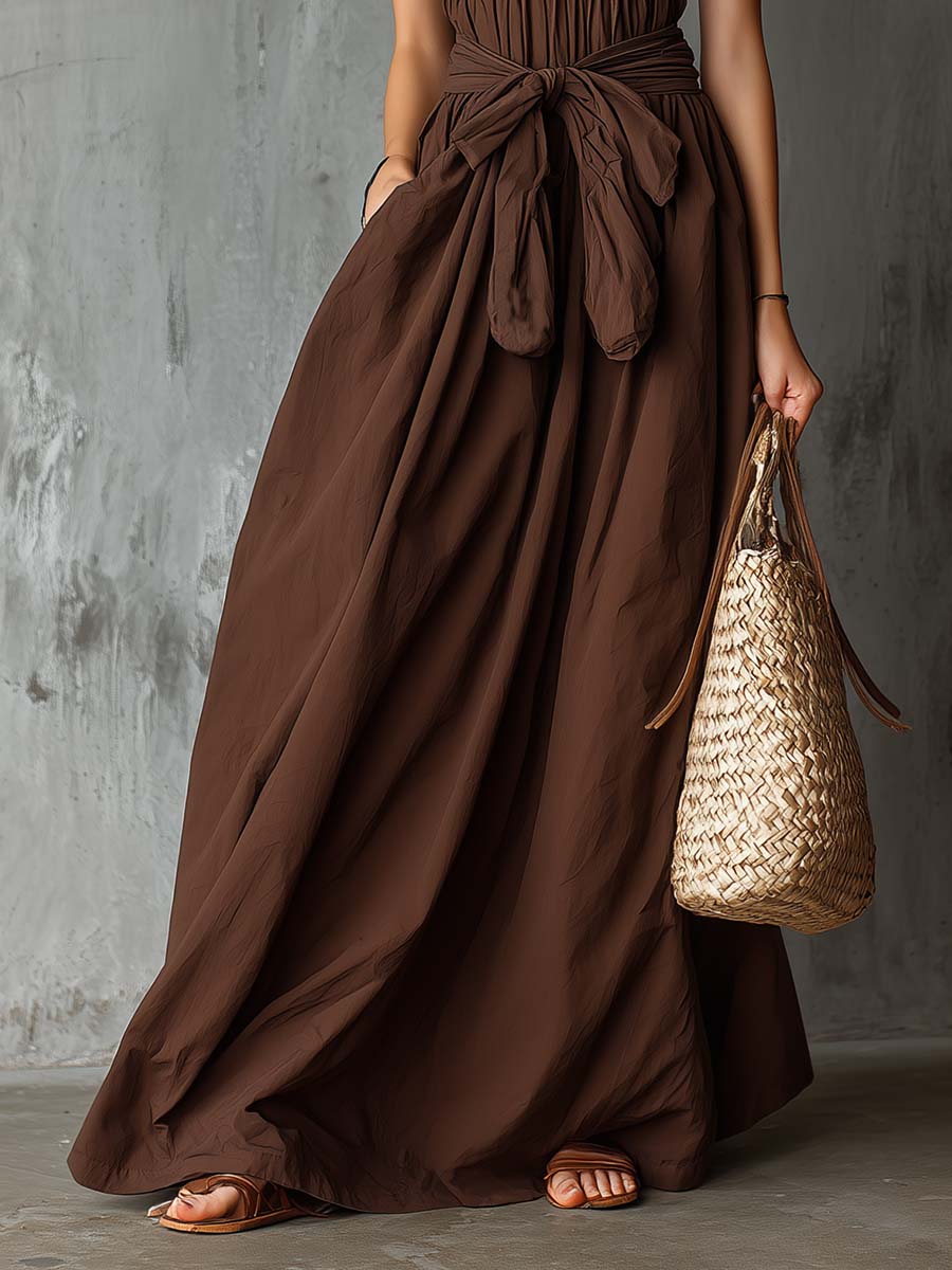 This elegant retro-inspired maxi dress combines timeless vacation charm with breathable comfort. Cut from soft brown cotton, the strapless design highlights the shoulders while an elasticized, secure bodice ensures a comfortable fit. The long, flowing skirt falls to a graceful maxi length with gentle tiers and gathers that create movement and a relaxed, feminine silhouette. Perfect for coastal strolls, resort evenings, or casual city outings, this dress balances vintage flair with modern ease.