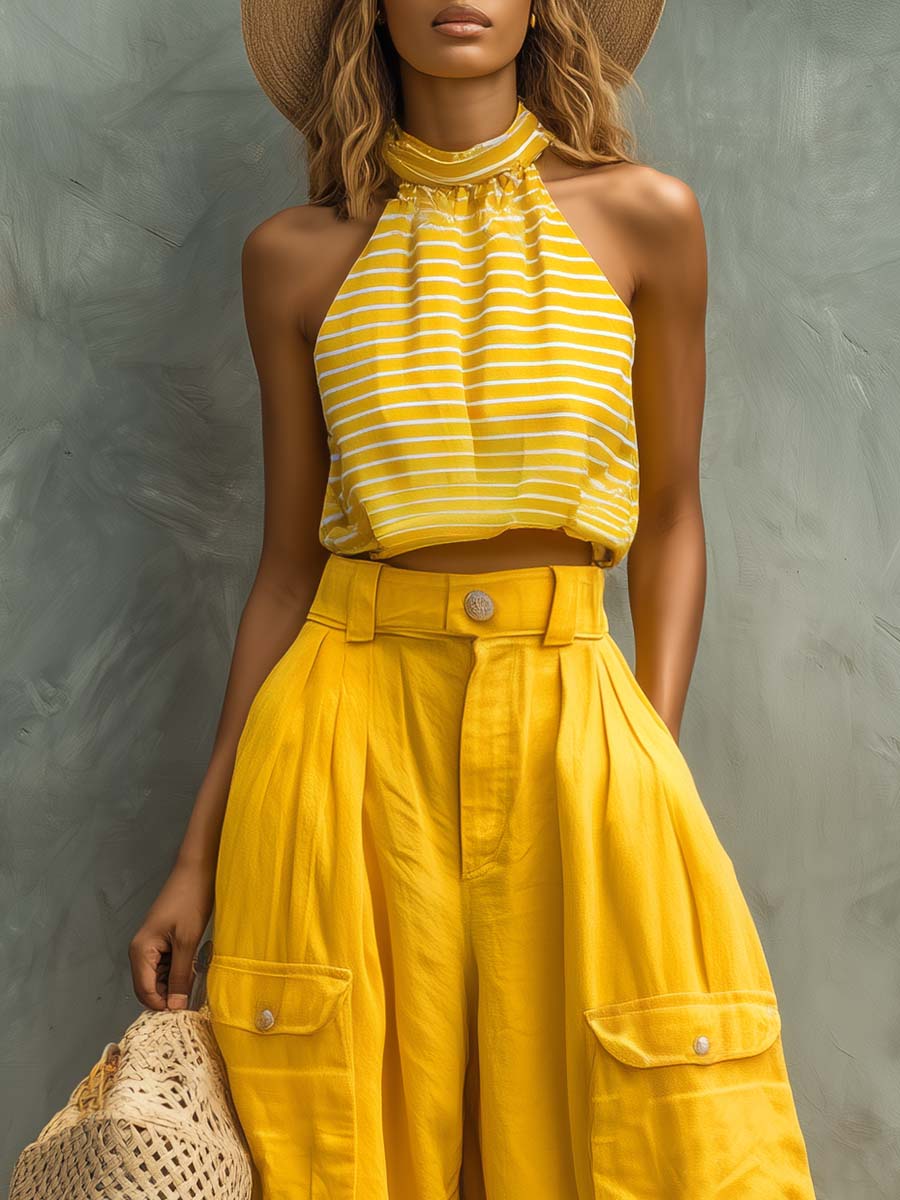 This two-piece set pairs a retro-inspired yellow striped satin halter top with breathable cotton-linen pants for an effortless summer look. The halter top features a soft satin drape and subtle sheen that catches the light, while the high-rise cotton-linen pants offer a relaxed, airy silhouette ideal for warm-weather travel and everyday wear.