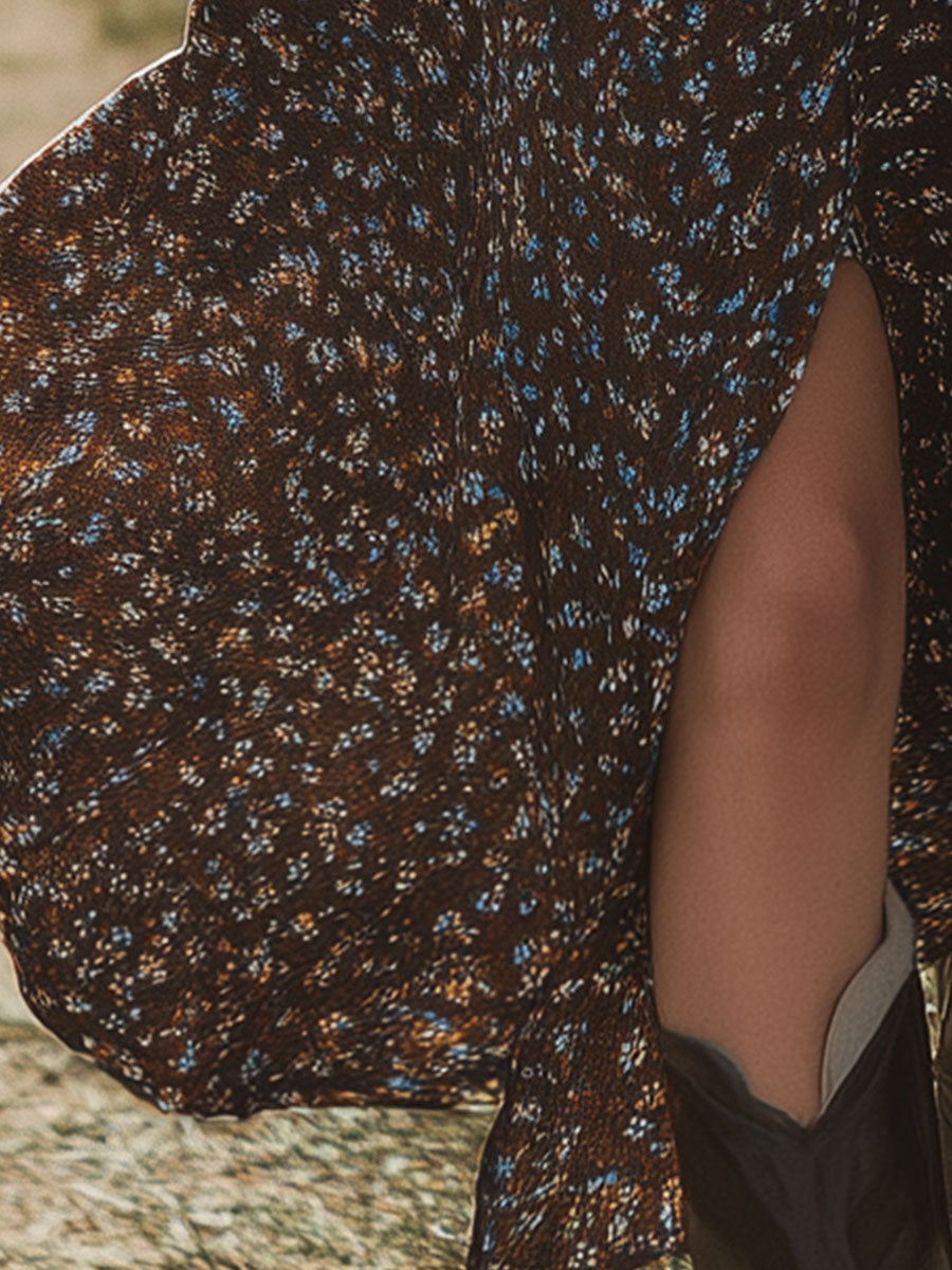 The midi length of the dress, complemented by a subtle slit, offers a perfect balance between modesty and modern flair. The slit adds a hint of allure and allows for comfortable movement, making it suitable for both daytime adventures and evening occasions. This dress can be effortlessly styled with ankle boots and a wide-brimmed hat for a Western-inspired look, or paired with simple flats and delicate jewelry for a more understated ensemble. Its unique blend of retro and contemporary elements makes it a versatile addition to any wardrobe, perfect for those who appreciate a touch of vintage sophistication.