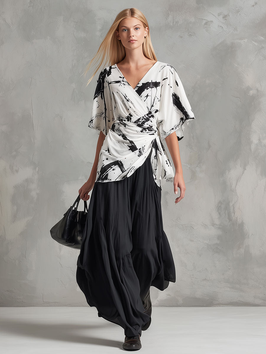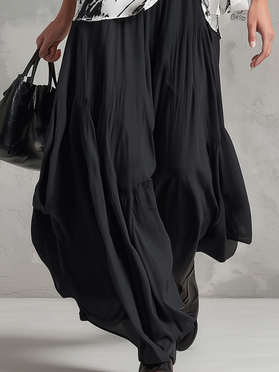 The retro-elegant color-block chiffon blouse and black skirt set is a sophisticated ensemble that seamlessly marries vintage aesthetics with contemporary style. The blouse is crafted from lightweight chiffon, offering a breezy and comfortable fit that is perfect for both casual and formal settings. Its color-block design features a harmonious blend of muted and bold tones, creating a striking visual contrast that draws the eye. The blouse's retro-inspired elements, such as a high neckline or subtle puff sleeves, add a touch of nostalgia while maintaining a modern edge.