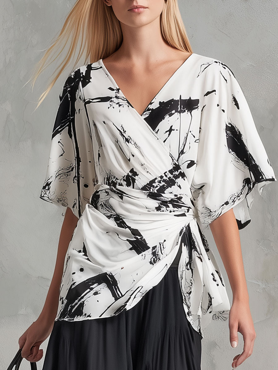 2.Design:V-neck, cinched waist, batwing sleeves, color blocking.