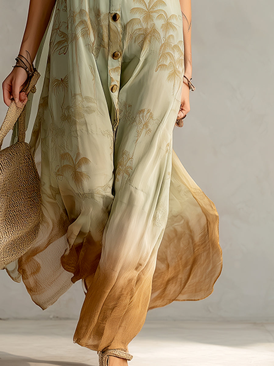 This retro-style chiffon maxi dress lets you enjoy a refreshing, sunny look. The lightweight, breathable fabric drapes beautifully, while the soft light green gradient and playful coconut palm print add a touch of elegance. Designed specifically for warmer seasons, the sleeveless cut and relaxed floor-length hem allow for freedom of movement, effortlessly creating a vacation vibe.