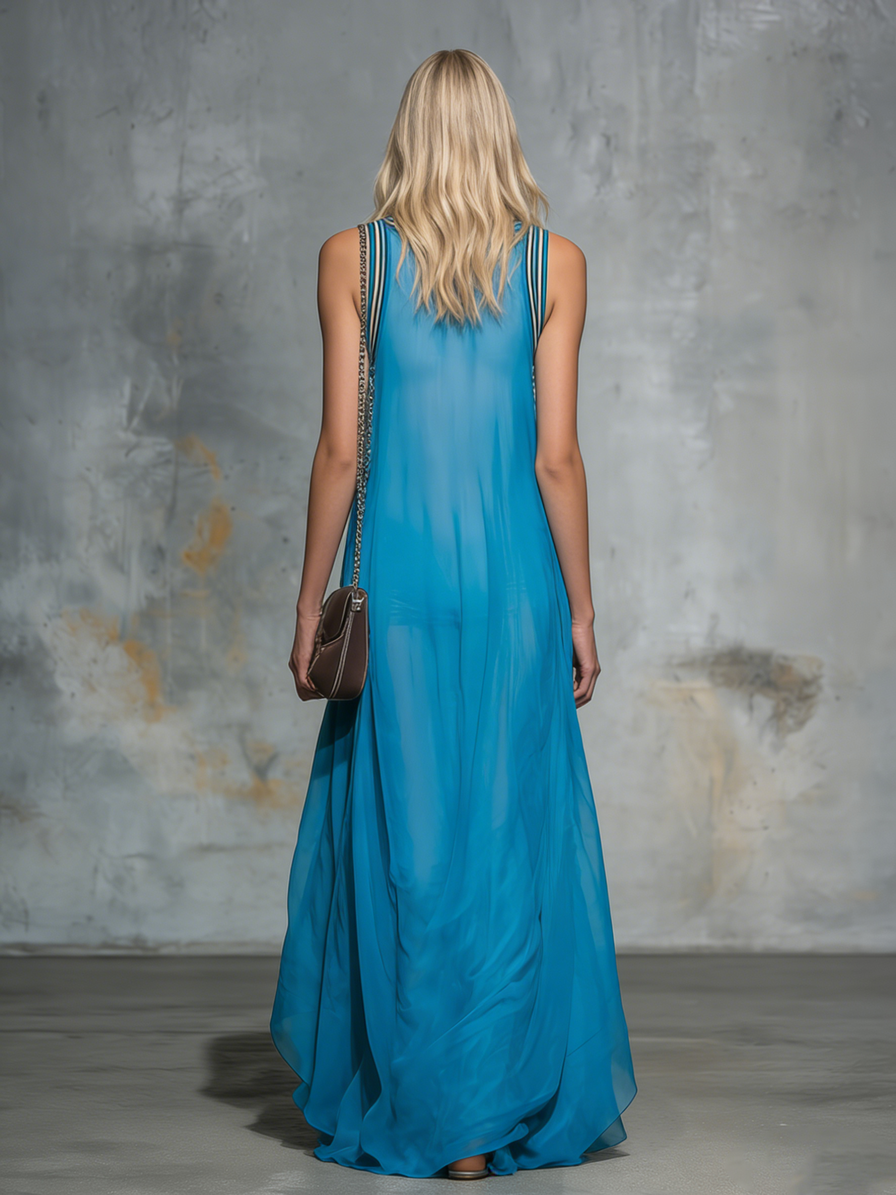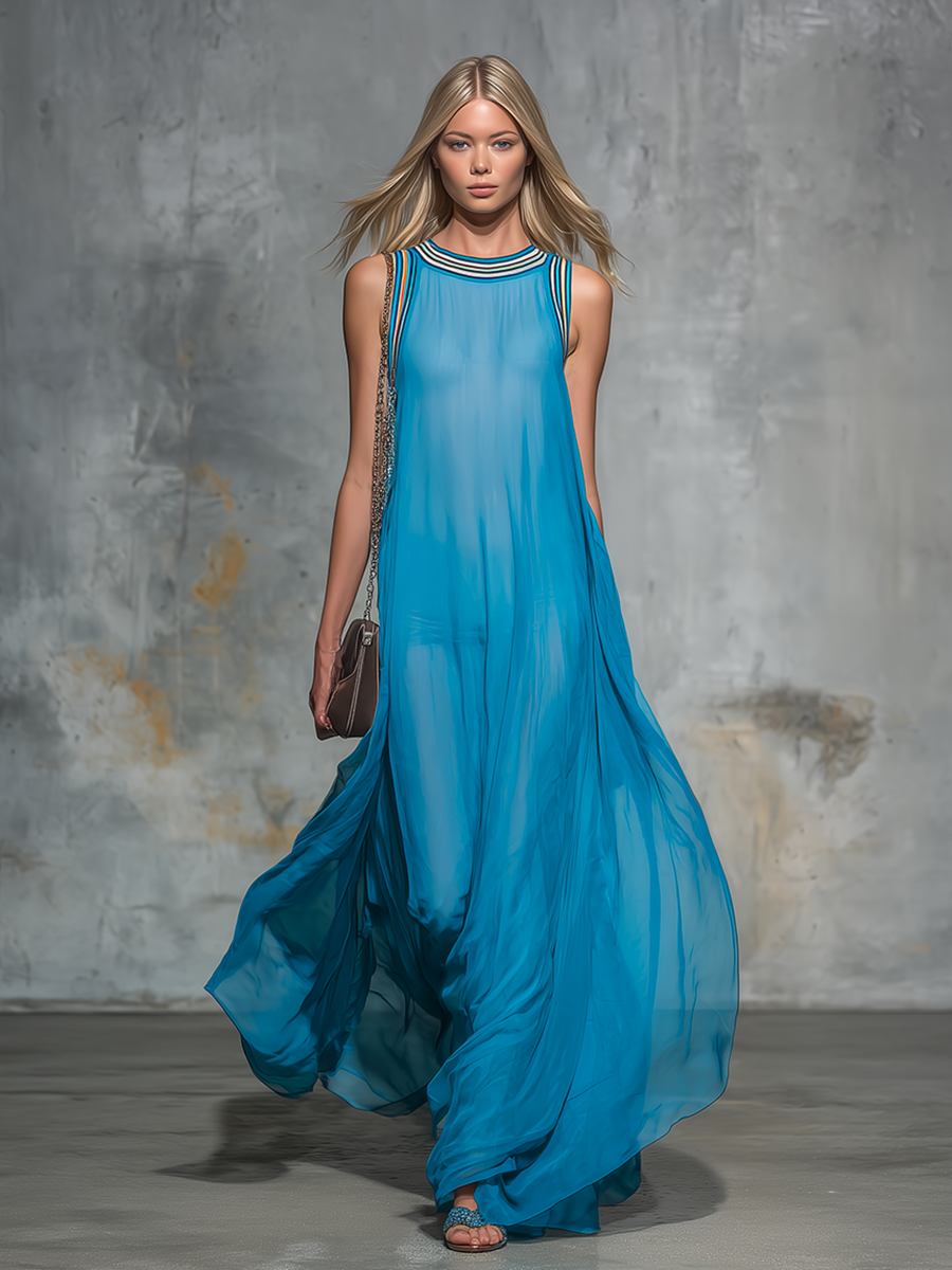 This casual yet stylish maxi features a round-neck, sleeveless bodice in lightweight chiffon with a crisp striped trim that accents the neckline and hem for a modern, sporty touch. The airy, fully lined skirt flows to a flattering maxi length with gentle movement and subtle A-line shaping, making it comfortable and breathable for warm days.