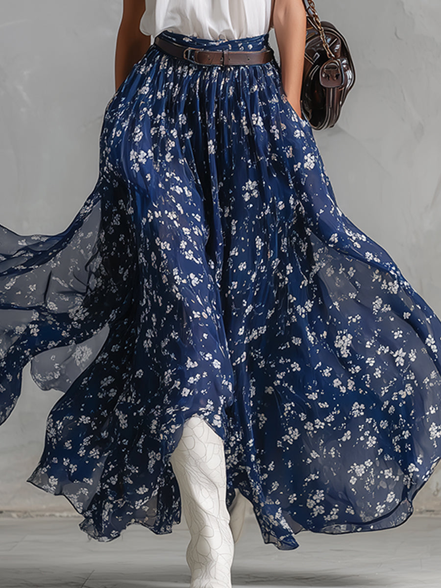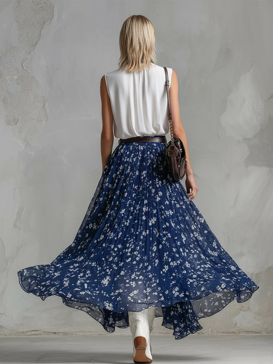 This is a fresh and charmingly feminine two-piece ensemble: a classic white sleeveless top paired with a flowing chiffon skirt featuring a soft, blue, scarf-style floral print. The top boasts a clean, crisp, minimalist silhouette that cleverly balances the skirt's romantic movement and intricate print details, creating an effortlessly chic aesthetic. It is the perfect choice for a variety of occasions—whether attending daytime events, enjoying a leisurely vacation, or dining out on a summer evening.