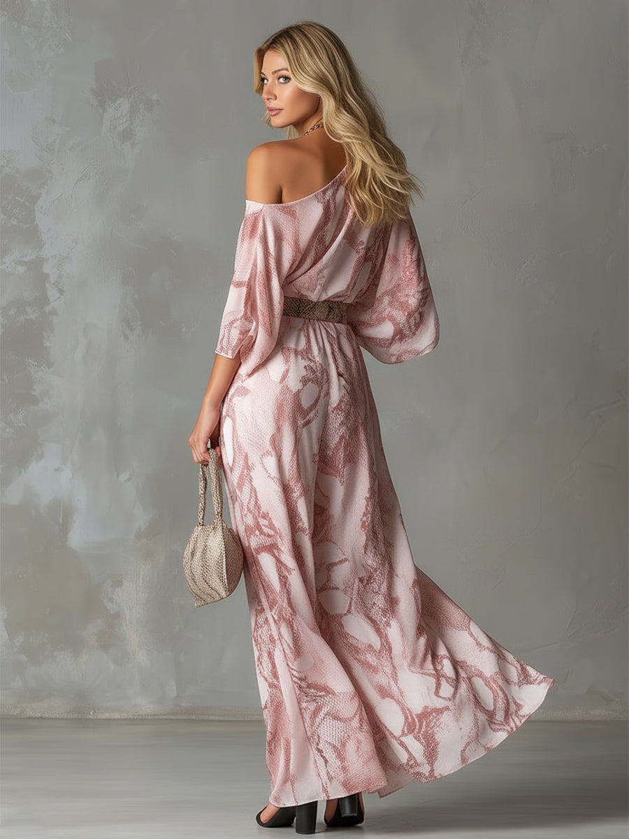 Retro Urban Style Pink Snake Print One-shoulder T-shirt And Wide-leg Pants Set