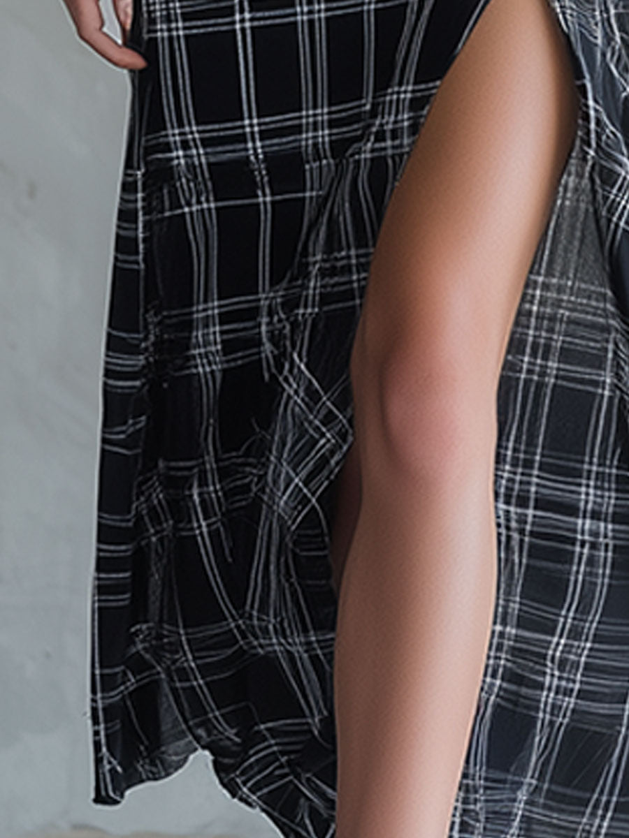 Stylish And Casual Black Knit Sleeveless Top And Plaid Chiffon Skirt Set