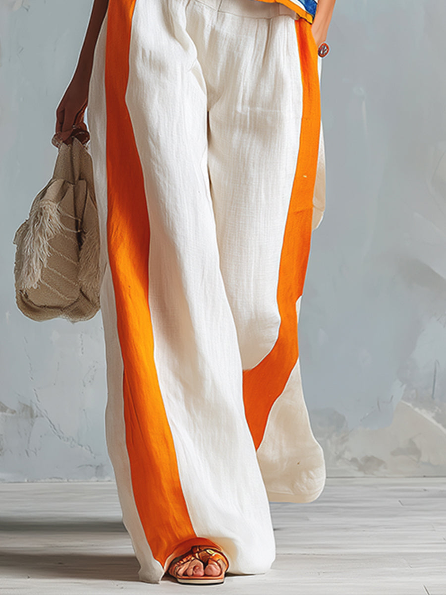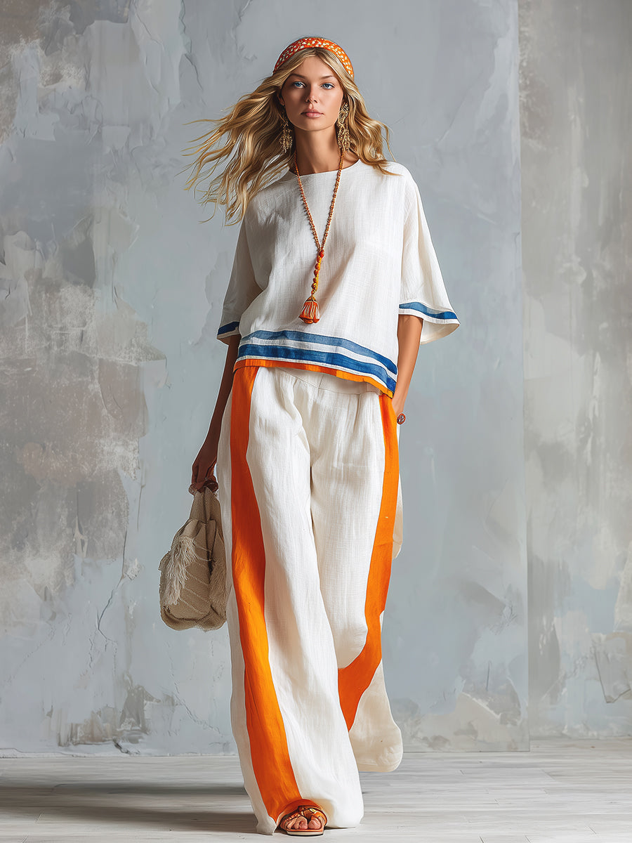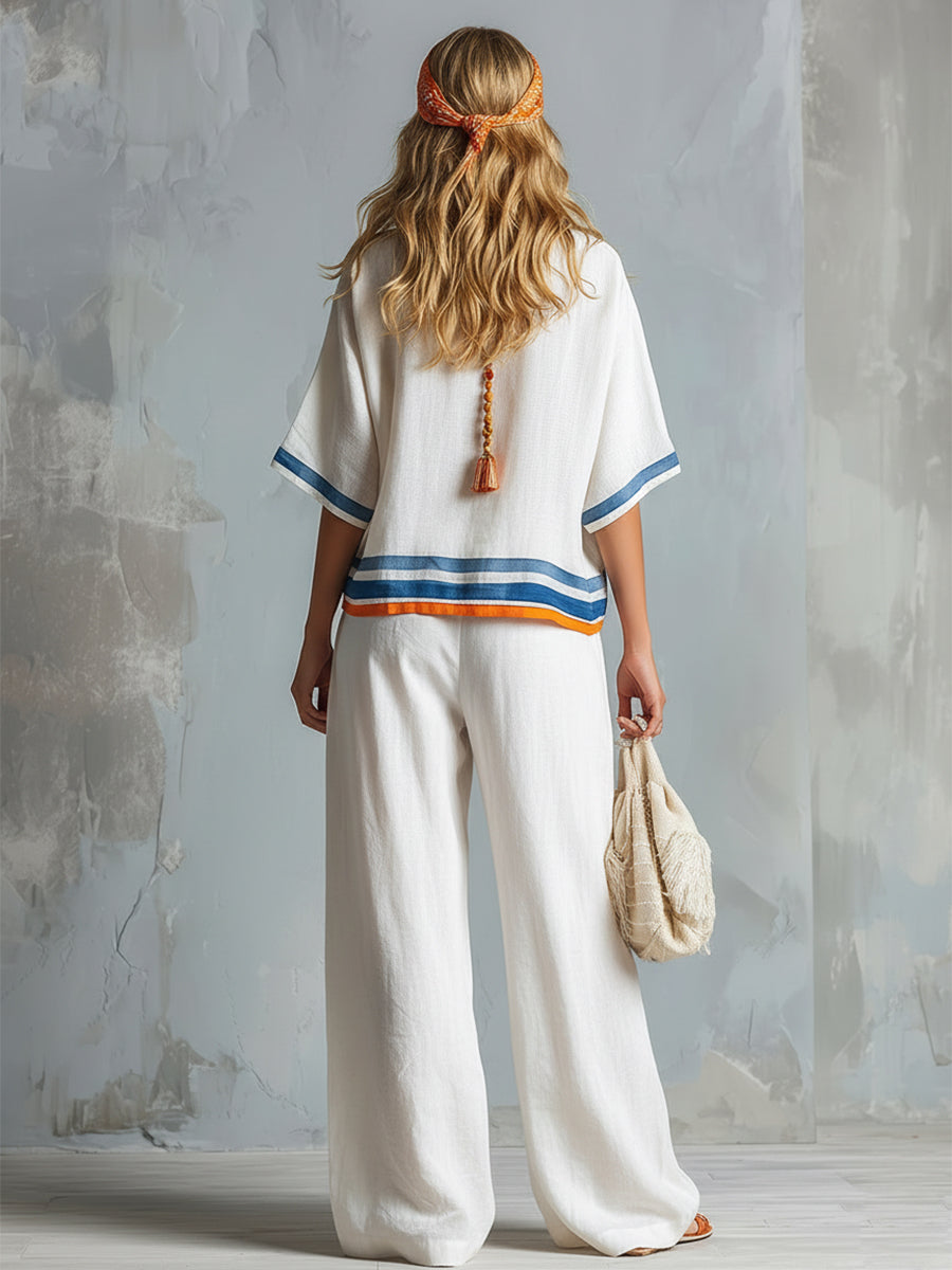 This two-piece set cleverly pairs a crisply tailored white T-shirt—accented with contrasting piping—with a pair of relaxed, wide-leg trousers crafted from a breathable cotton-linen blend. The clean lines and minimalist piping design lend the ensemble a modern, urban aesthetic, while the fabric’s natural texture ensures comfort and a sense of effortless ease during the warmer seasons.