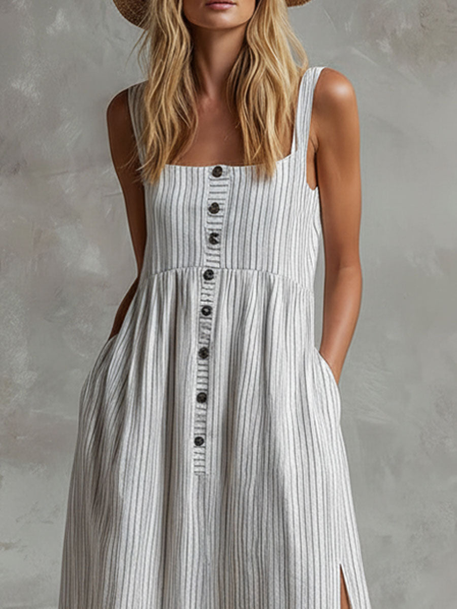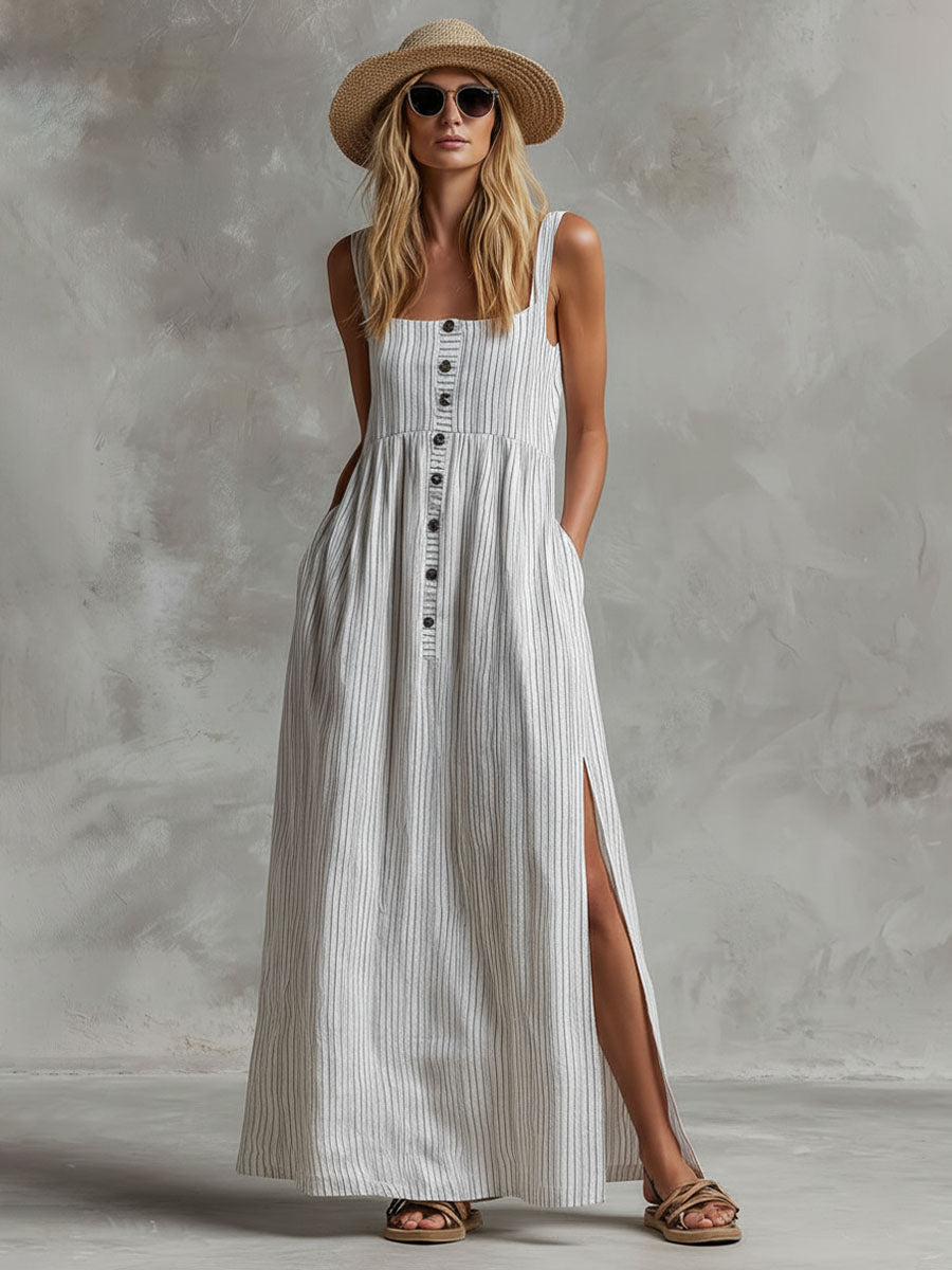 Embrace timeless bohemian charm with our Retro Boho Square‑Neck Cotton‑Linen Striped Sleeveless Maxi Dress. Crafted from a soft, breathable cotton‑linen blend, this dress combines natural texture with an airy, flowy silhouette that’s perfect for warm days. The square neckline adds a subtle vintage touch, accentuating the shoulders and collarbone, while the sleeveless cut enhances comfort and ease of movement. Vertical stripes elongate the figure and lend a relaxed, retro character.