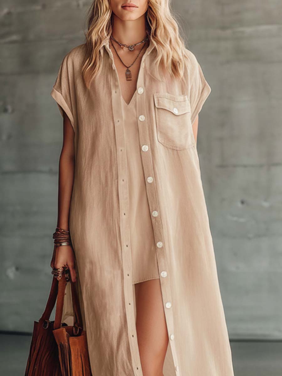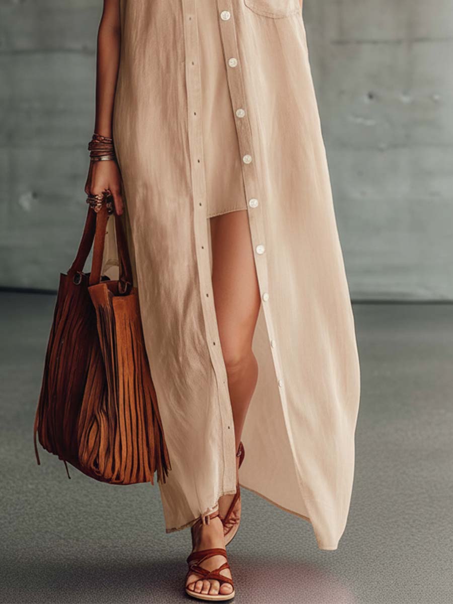 This two-piece set includes a sleeveless camisole mini dress and a matching long cover-up, crafted from a soft cotton-linen blend in a warm pink tone. The dress features a relaxed, easy silhouette ideal for warm-weather travel or everyday summer wear, while the long duster-style cover-up adds lightweight layering for sun protection and a touch of retro-western flair. The overall look is casual, breathable, and effortlessly feminine — perfect for beach days, city strolls, or laid-back evenings.