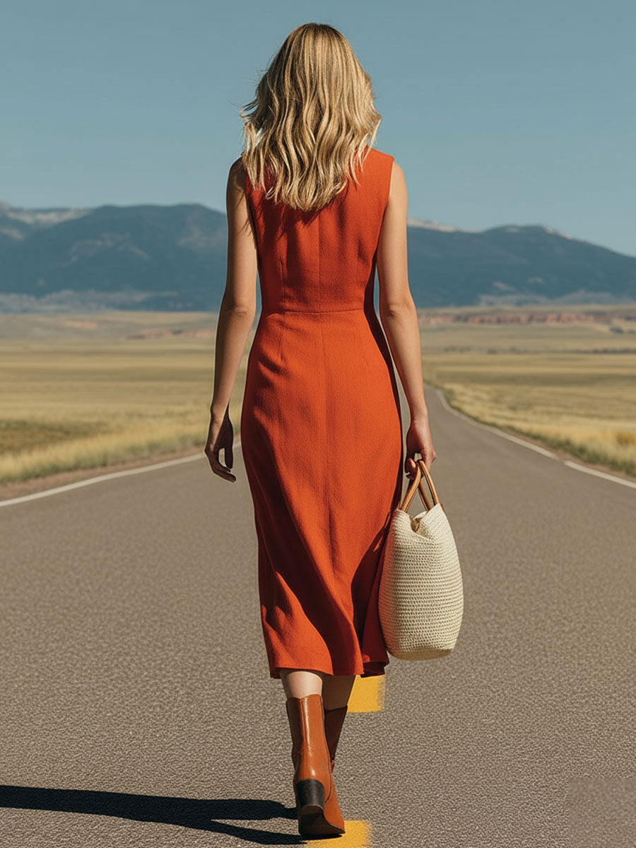 This Western retro casual midi dress in a vibrant orange hue captures the essence of laid-back elegance with a touch of vintage flair. Made from a blend of cotton and linen, the dress offers a breathable and lightweight feel, perfect for warm days or transitional seasons. The sleeveless design enhances its casual appeal, allowing for easy layering with a denim jacket or a cozy cardigan. The midi length strikes a balance between comfort and style, making it suitable for a variety of occasions, from brunch outings to casual gatherings.